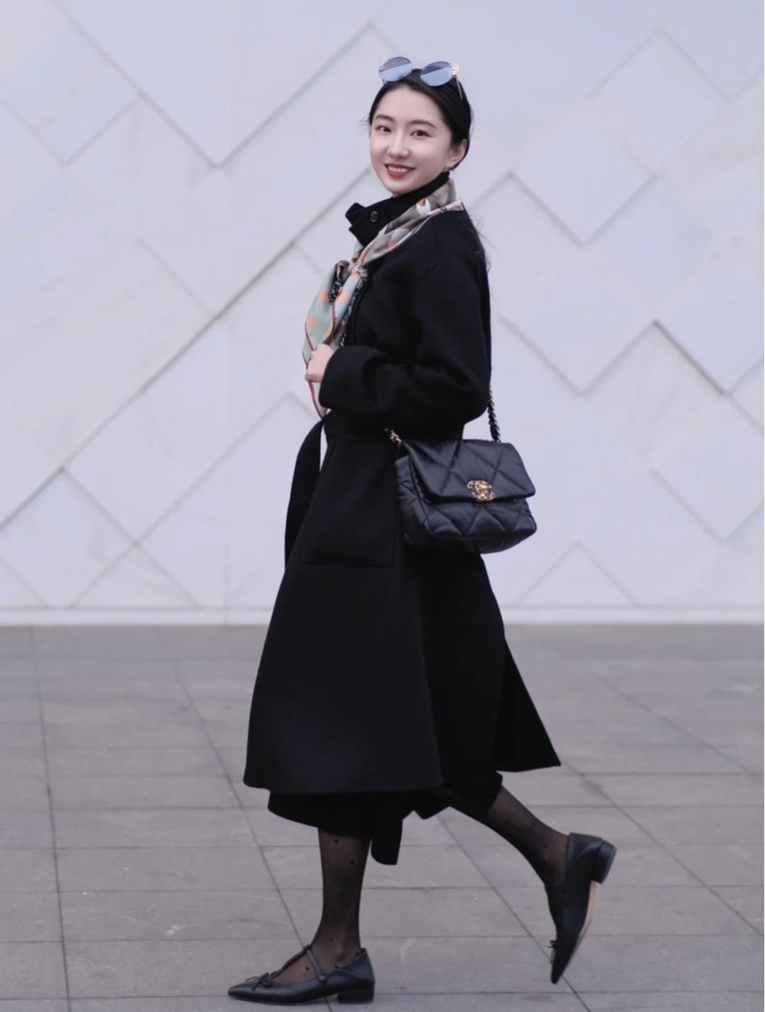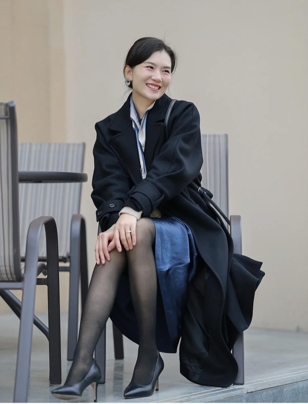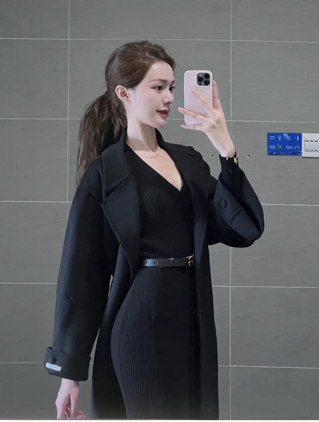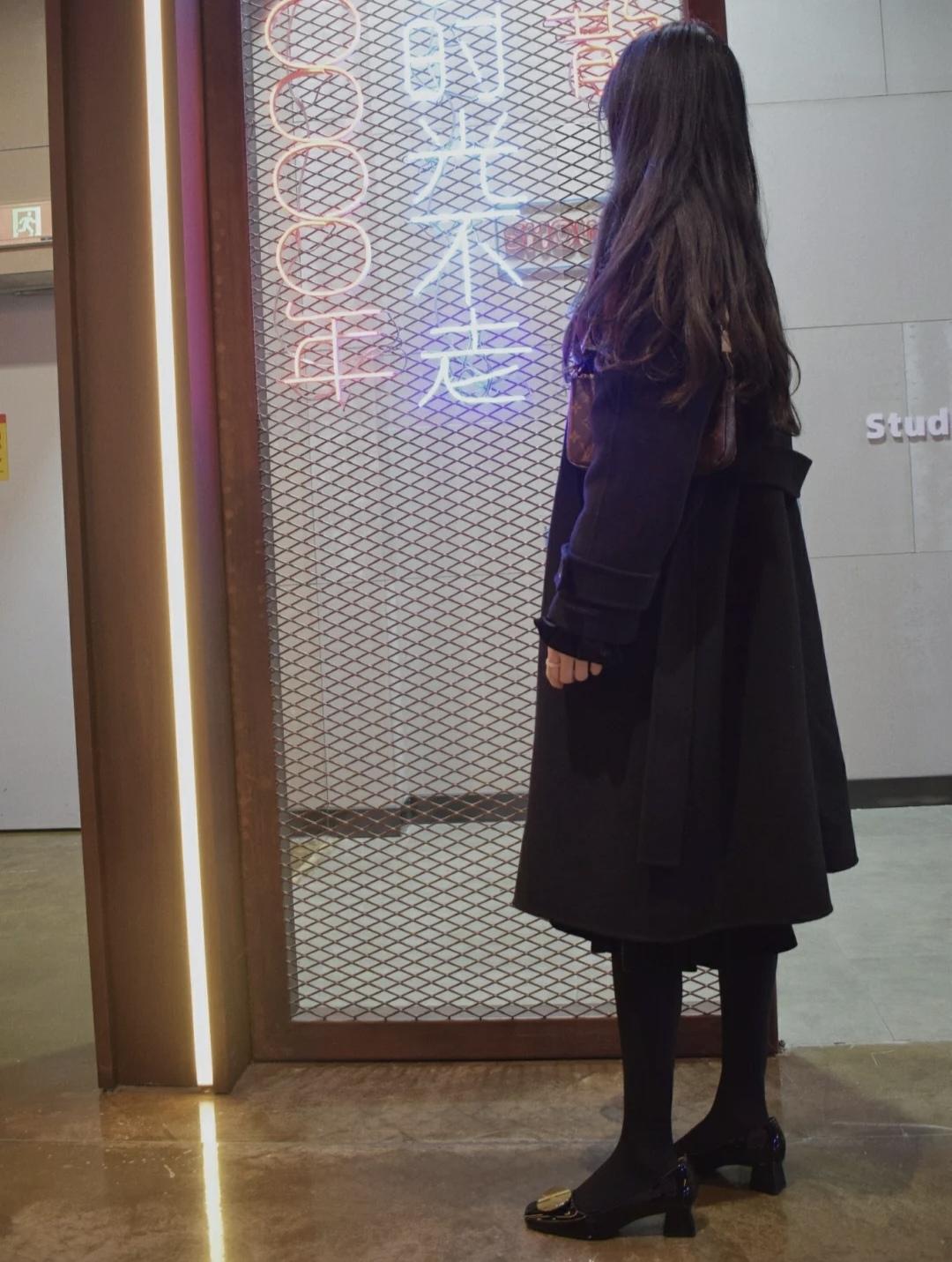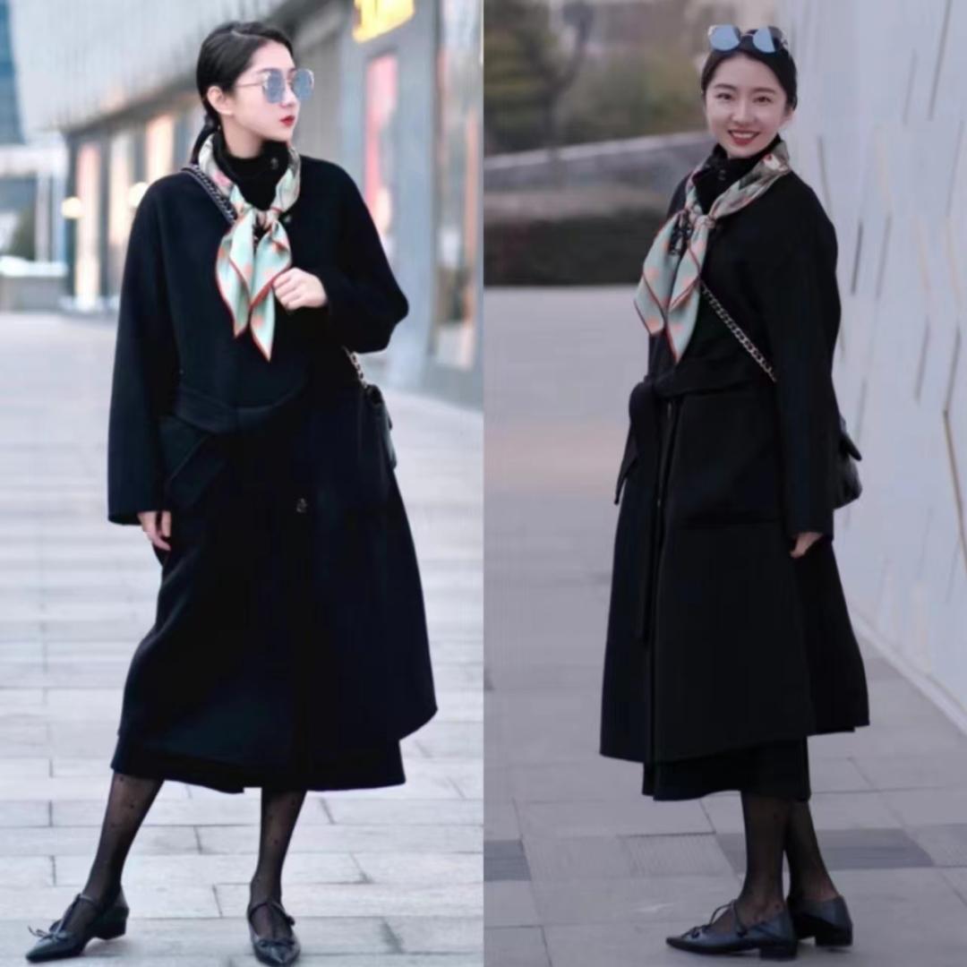 这件黑色浴袍大衣太有气质了,本来担心会不会大,结果穿上身喜欢得不得了,长度刚好到小腿,不压身高又遮肉,适合小个子。搭配柔软的玛丽珍鞋和打底裤,优雅又不失休闲感!
