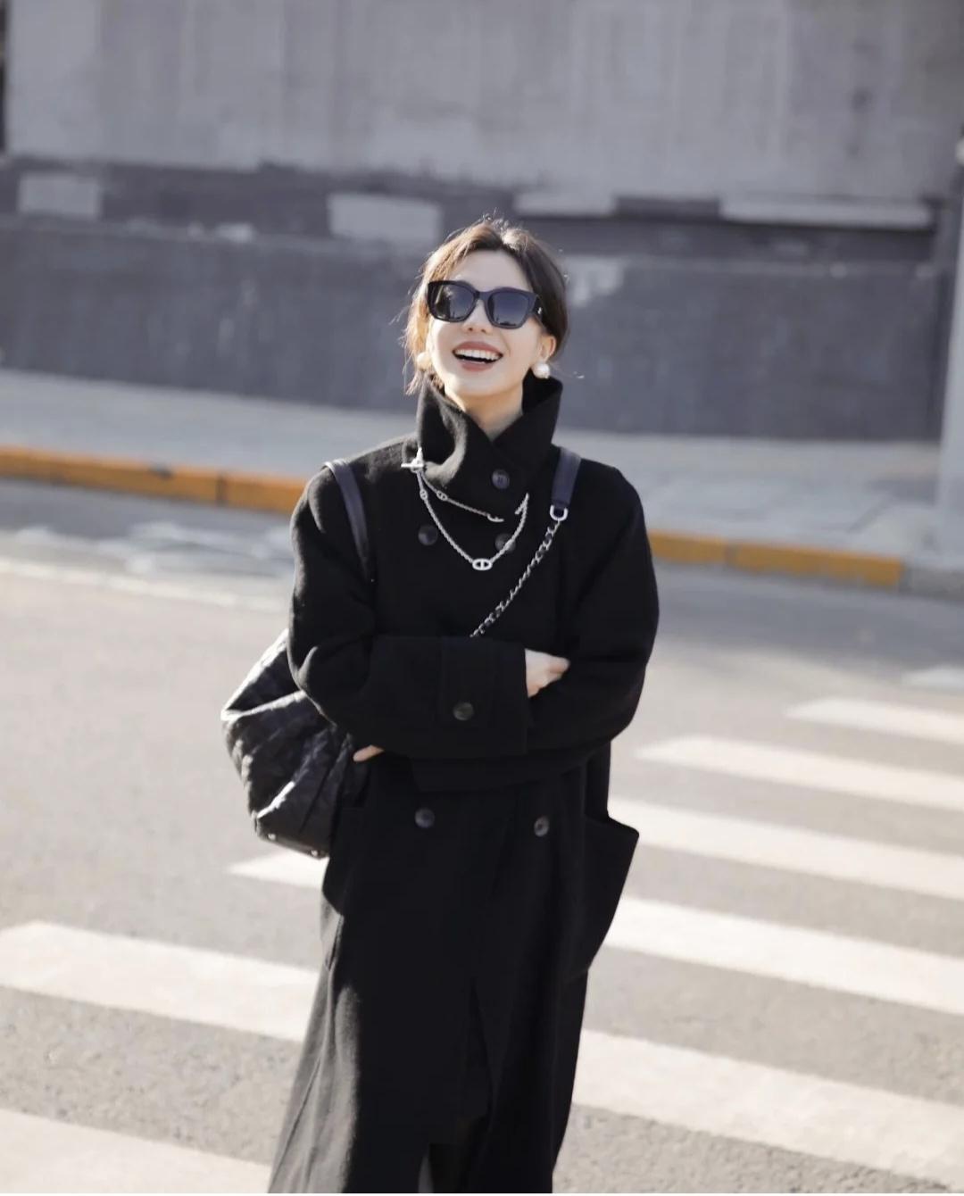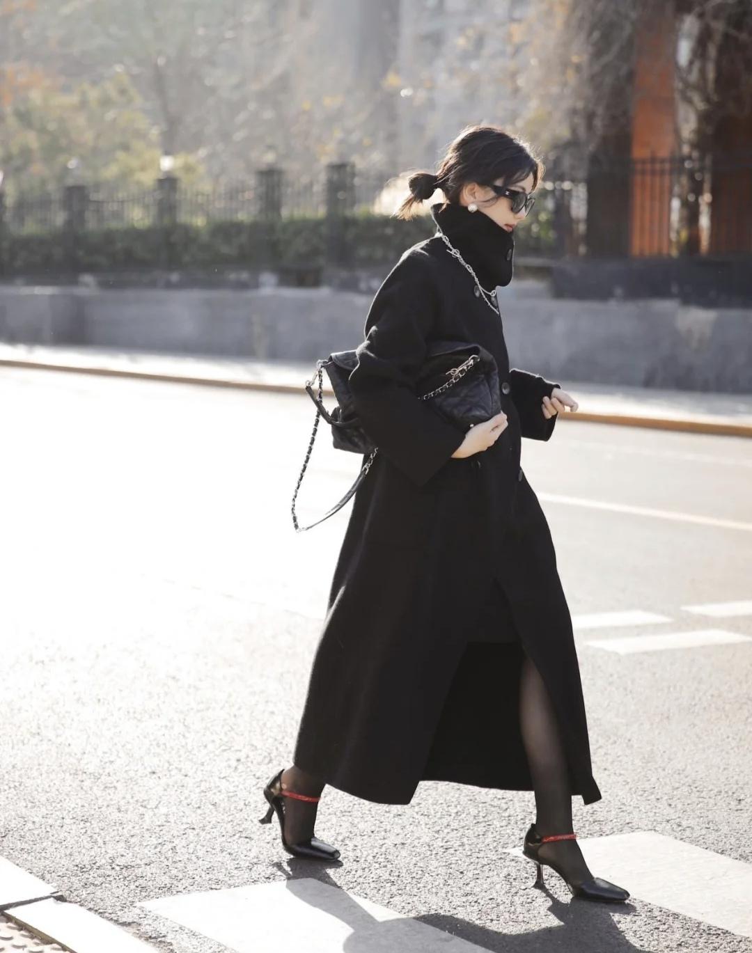 一袭黑色立领大衣配墨镜红唇,踩着黑色猫跟鞋阔步走在街头,手挽超大size vintage包,颇有几分明星出街的气势,气场十足+酷飒有型。