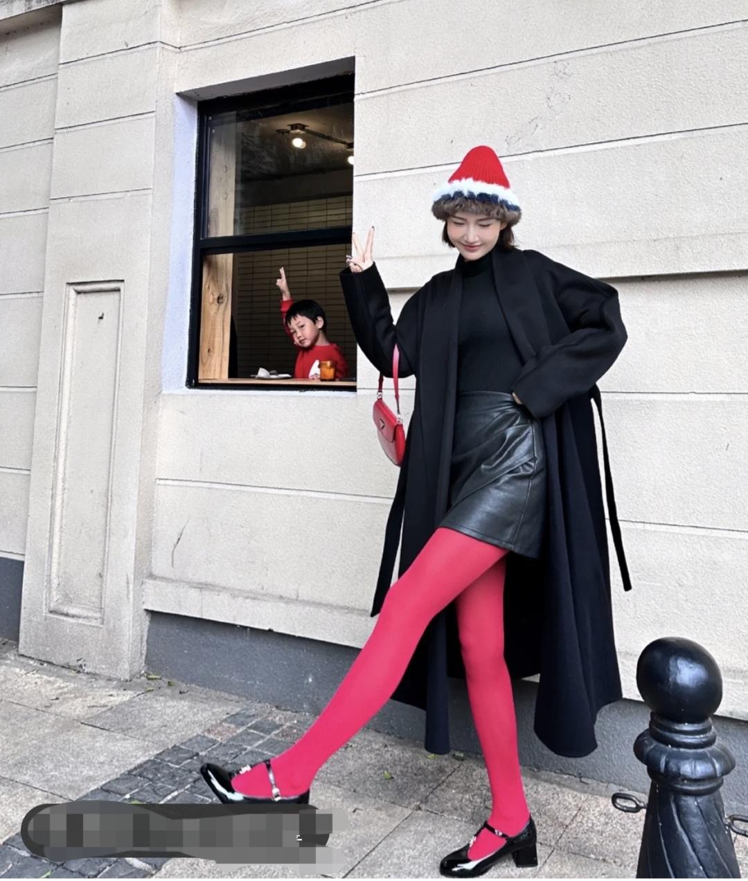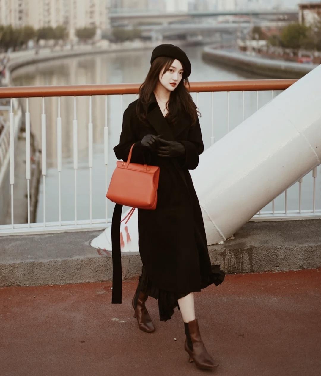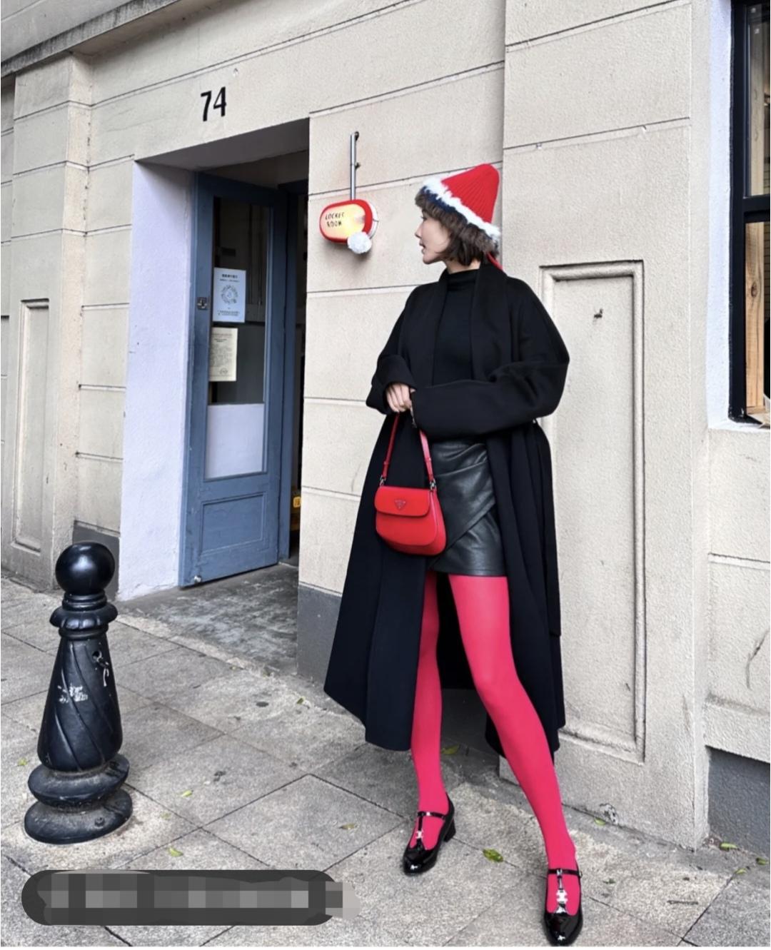 宽宽大大的浴袍大衣裹着好有感,黑色的单穿会略显沉闷,所以搭了条亮色的丝袜和小配饰氛围感一下就上来了,红色针织帽和手提包的点缀,圣诞氛围感一下子就来啦。