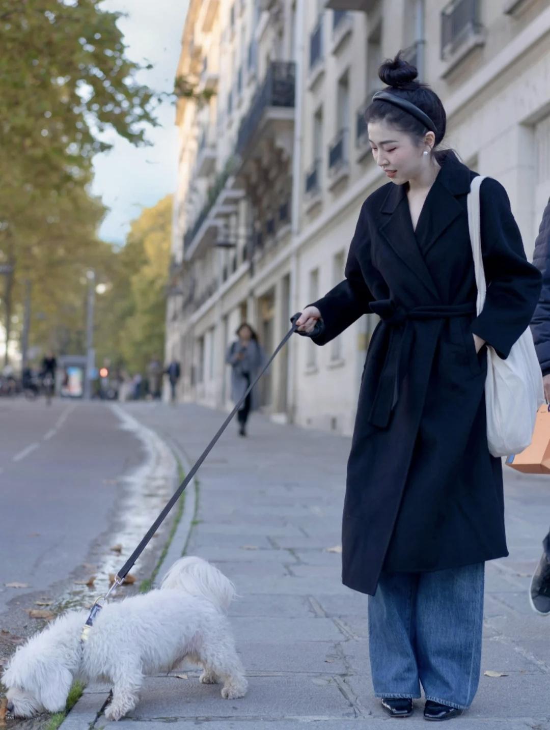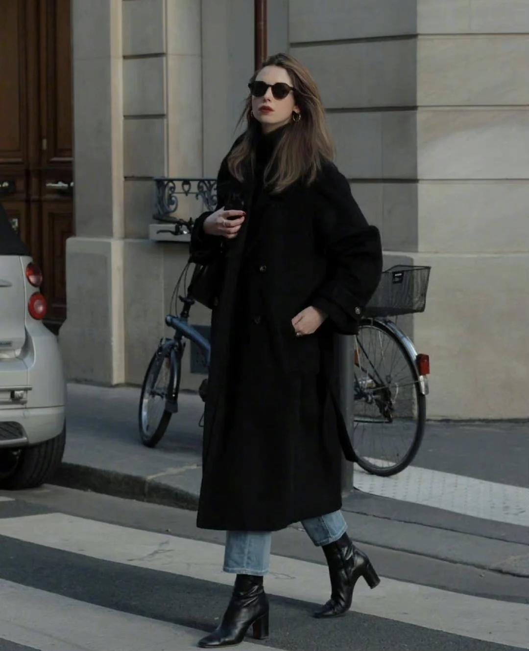 法国女人对浴袍大衣的爱,始终如一。接下来就来学习经典款黑色浴袍大衣的穿搭示范吧。