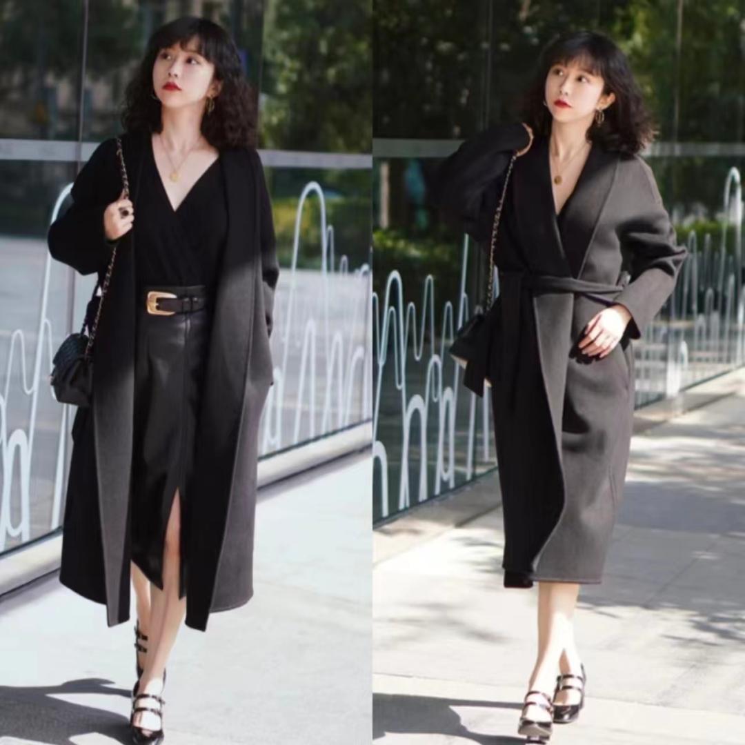今年很火的浴袍式大衣果然谁穿谁好看,这件无论是从剪裁还是面料都特别有质感显档次,有垂感不易皱+穿上显气质;内搭黑色紧身针织裙显身材太绝了,敞开大衣或者单穿都超好看。