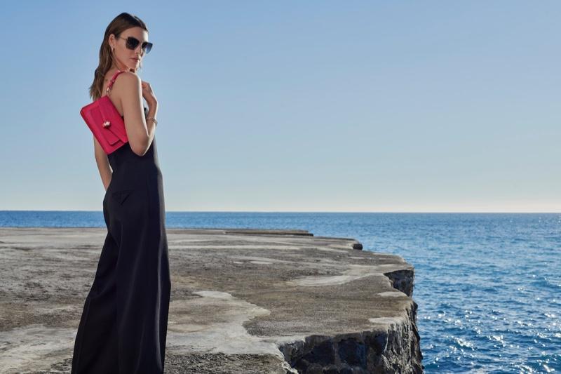 就像它的名字一样,该系列的灵感来自于伊甸园的雄伟壮丽,一条蛇在伊甸园中滑行并引诱夏娃。手袋的提手和优雅的蛇头封扣以爬行动物为原型。在一张照片中,Vittoria Ceretti 身穿全黑套装,包括墨镜、夹克和裤子,展示了一条翠绿色的 Serpenti Forever East-West。