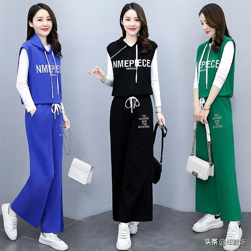 时尚休闲字母阔腿裤三件套套装连帽三件套裤,休闲松紧腰,显瘦不挑人。颈部时尚的连帽设计,彰显出你的干练气质。腰部松紧腰设计,展现纤细的腰部曲线。简约大气的口袋,增加了实用的功能性。