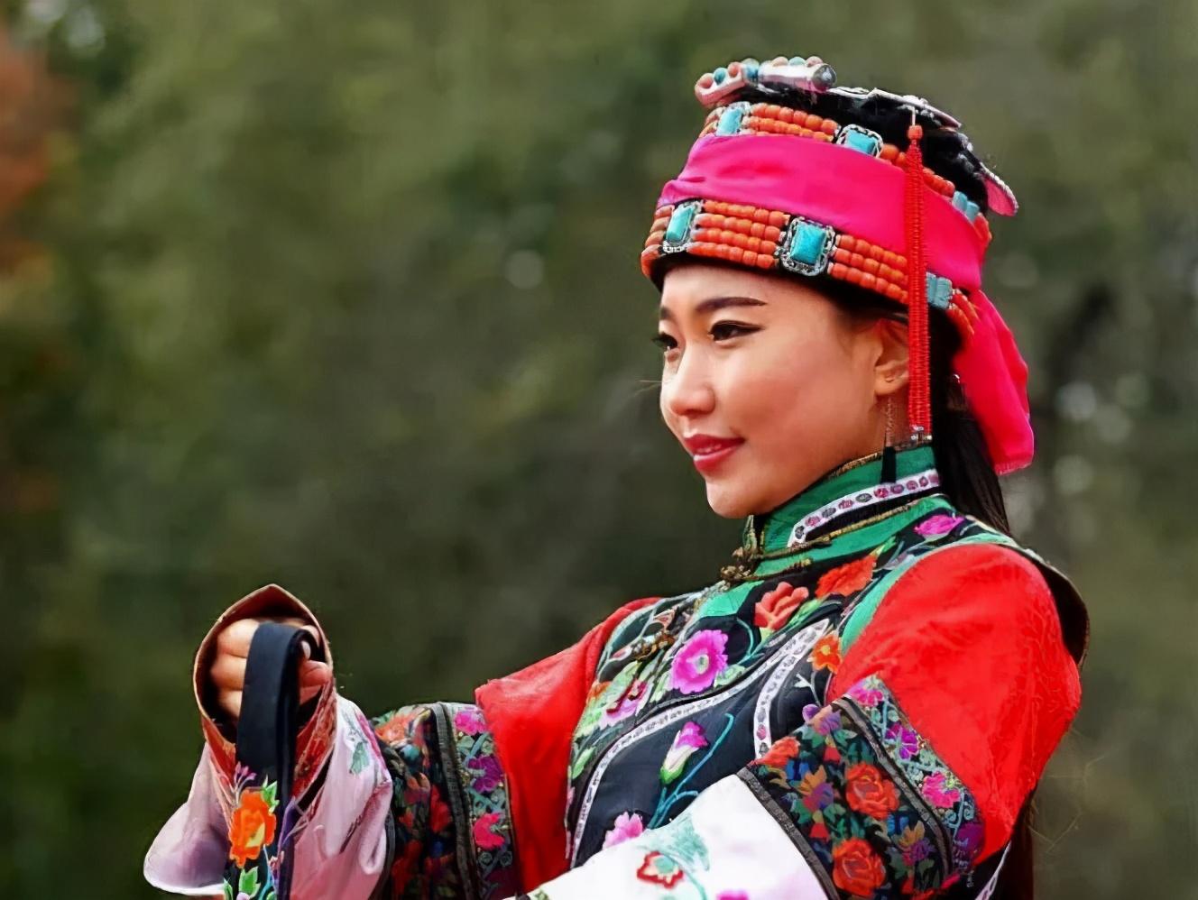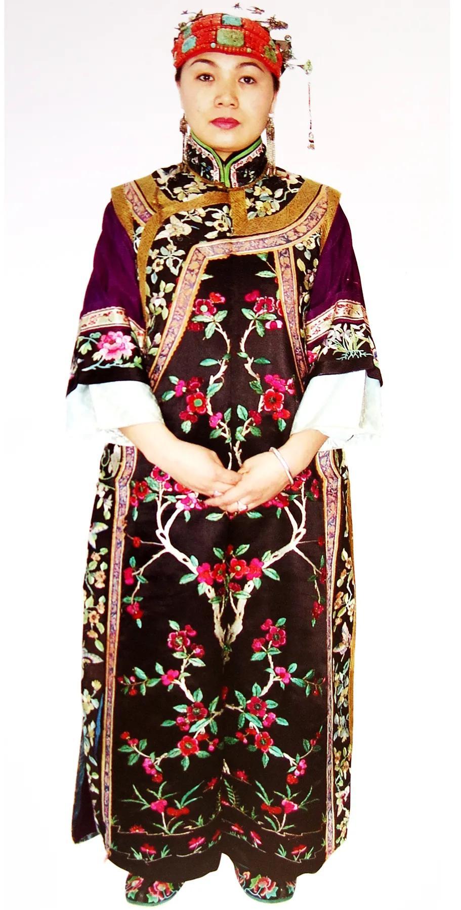 科尔沁部落因居住地与满族毗邻,其装饰风格深受满文化影响,头饰为珊瑚珠串头围带插各式簪钗,袍服制作亦吸收满式风格,并注重绣花、贴花、盘花等工艺运用。