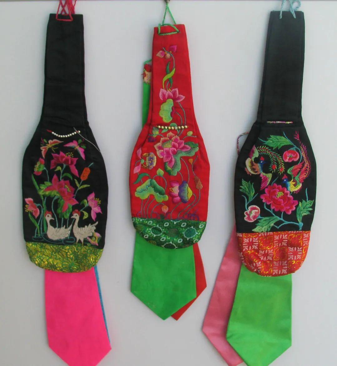 内蒙古东部地区烟口袋以黑布为地,呈瓶状,装饰花卉动物纹,颈部背面中段至上端开有条竖口,开口处系三色飘带,用于盛放烟叶。