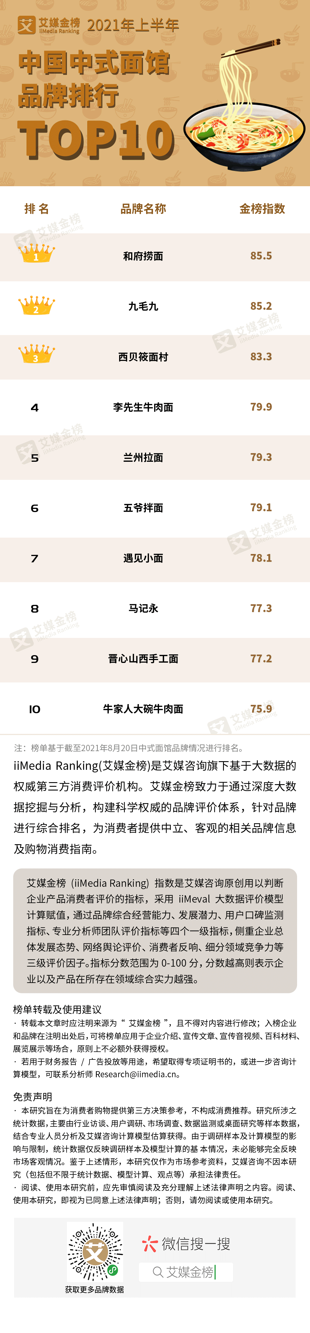 iiMedia Ranking艾媒金榜新发布《2021年上半年中国中式面馆品牌排行0》,对2021年上半年中国中式面馆进行排名。此榜单采用iiMeval大数据评价模型计算赋值,通过企业综合实力指标、全网媒体传播态势评价指标、用户口碑监测指标、专业分析师团队评价指标等综合评选而出。