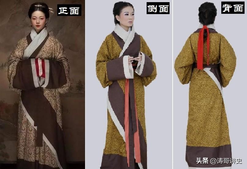 但通过汉服实物,能很清楚地看到所谓的“曲裾”其实是把三角形衣襟开到腋部,然后绕过穿着者的身后,后绕回前衣襟再用束带固定。这对我们之前的许多历史认知具有极大的颠覆性。
