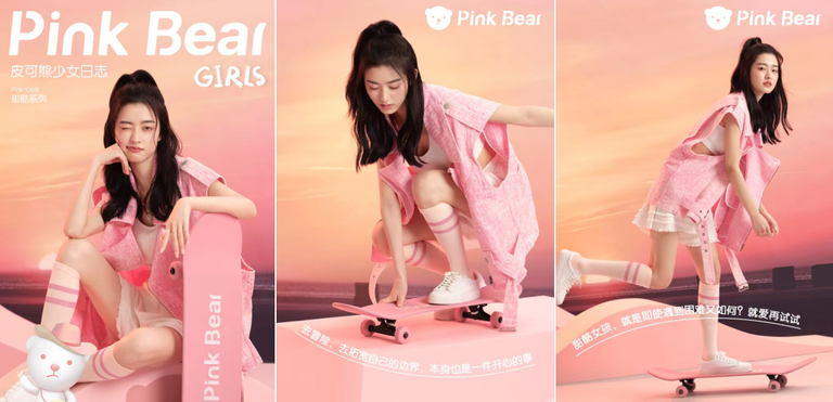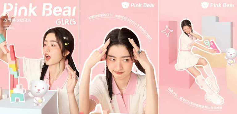在Pink Bear皮可熊眼中,粉色是直击美好的超能力,是永不失落的少女心,是回到快乐简单的方法。每一个心怀少女梦想的女孩,都可以变身成为鲜活闪耀的皮可熊少女。在这里,少女们可以是喜欢捕捉日常美好的梦幻甜心,可以是勇于不断尝试的态度Cool girl,也可以是拥有奇思妙想的鬼马精灵。《PinkBearGIRLS》少女日志三大系列的官宣,鼓励每一位【皮可熊少女】成为任何想成为的自己。Pink Bear皮可熊愿意陪伴少女们,带来“每天一点小美好”。
