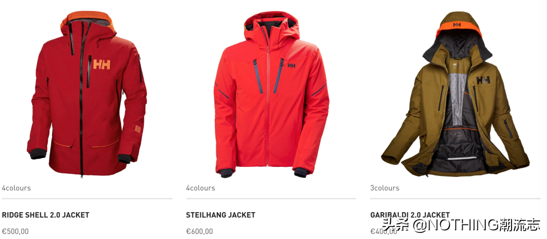 来自挪威的HellyHansen在1877年就创立的,的HH专营航海、滑雪装备,相比于羽绒线,它们更的是冲锋衣系列。
