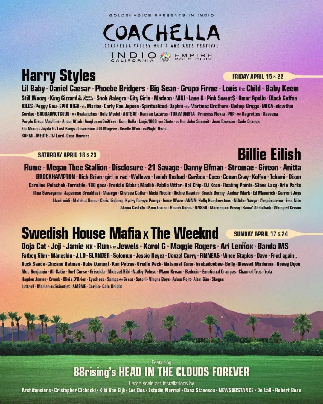 2022 Coachella音乐节可谓是众星云集,碧梨Billie Eilish、哈卷Harry Styles、盆栽The Weeknd、Danny Elfman、宇多田光等都轮番上场,台上是星光璀璨的歌手阵容,台下观众也是自带焦点。