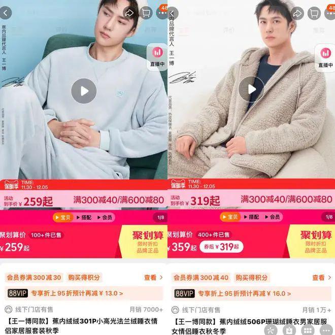 对比市面上同品类产品的售价看,由王一博代言的“蕉内品牌睡衣,用料页面显示未为聚酯纤维的两个热销款售价分别为259元、359元。
