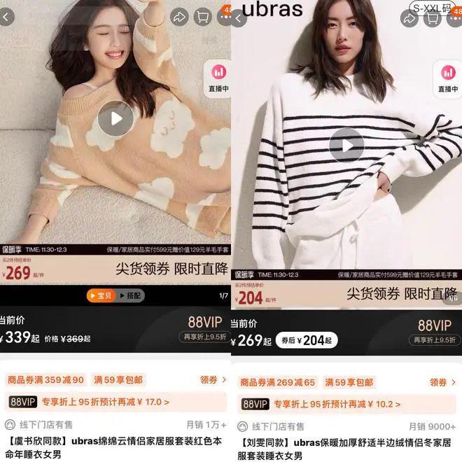 欧阳娜娜曾代言过的品牌Ubras官方旗舰店中,和虞书欣同款、用料为聚酯纤维的睡衣套装定价为339元,和刘雯同款的睡衣套装,用料显示为聚酯纤维92%、聚酰胺纤维(棉纶)7%、聚氨酯弹性纤维(氨纶)1%的睡衣套装售价为269元。
