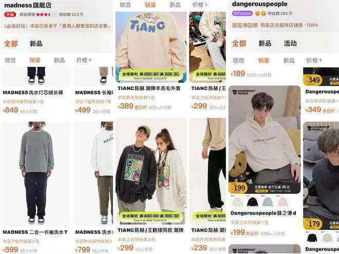 从明星品牌的售价和销量对比看,余文乐创立的品牌Madness均价在500以上,官网销量好的灯芯绒长裤(849元)月销量为46件,其次为长袖印花T恤(499元)月销量为36件。定价相对低的明星品牌在销量上则更好,例如陈赫创立的TIANC均价在200-300元,其天猫旗舰店内销量较好的羊羔毛外套(389元)和卫衣(299元)月销量分别超400件、300件。而薛之谦的Dangerouspeople售价在100-300元,受众面更广,销量大都能上千。