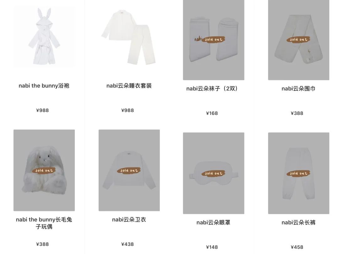 目前,“nabi”在其官方小程序上售的8件“云朵胶囊新系列”产品,除了浴袍和睡衣套装外均已售罄。