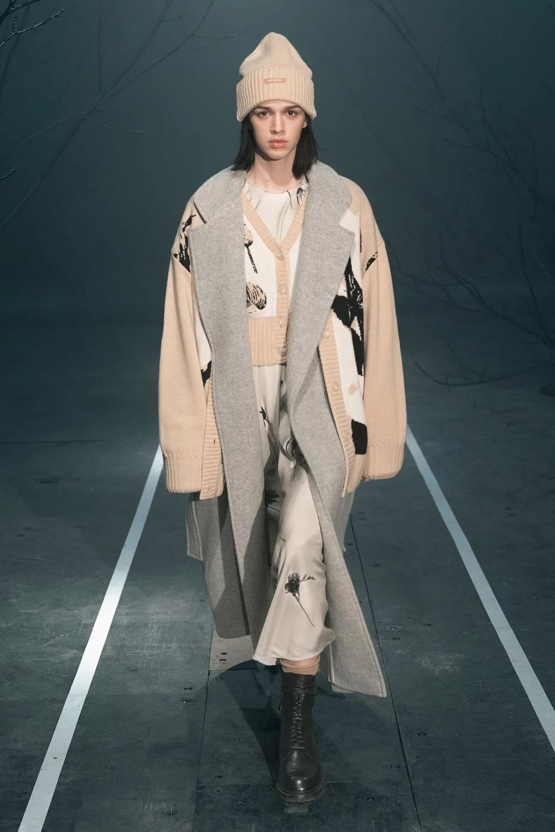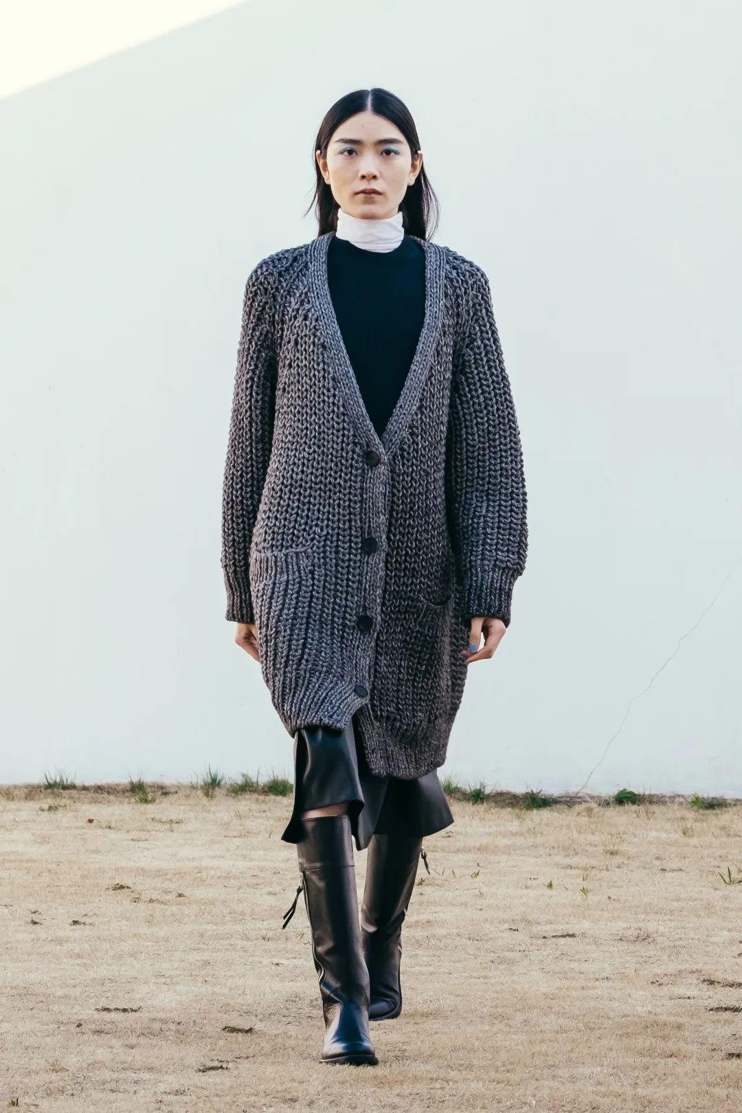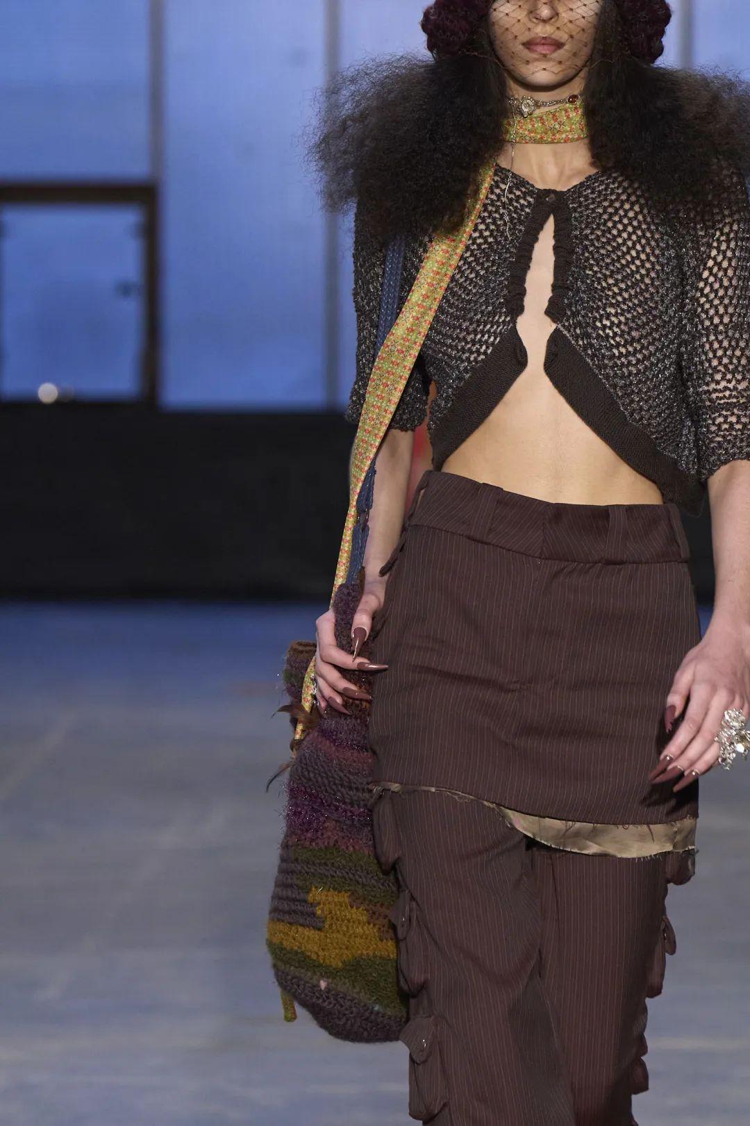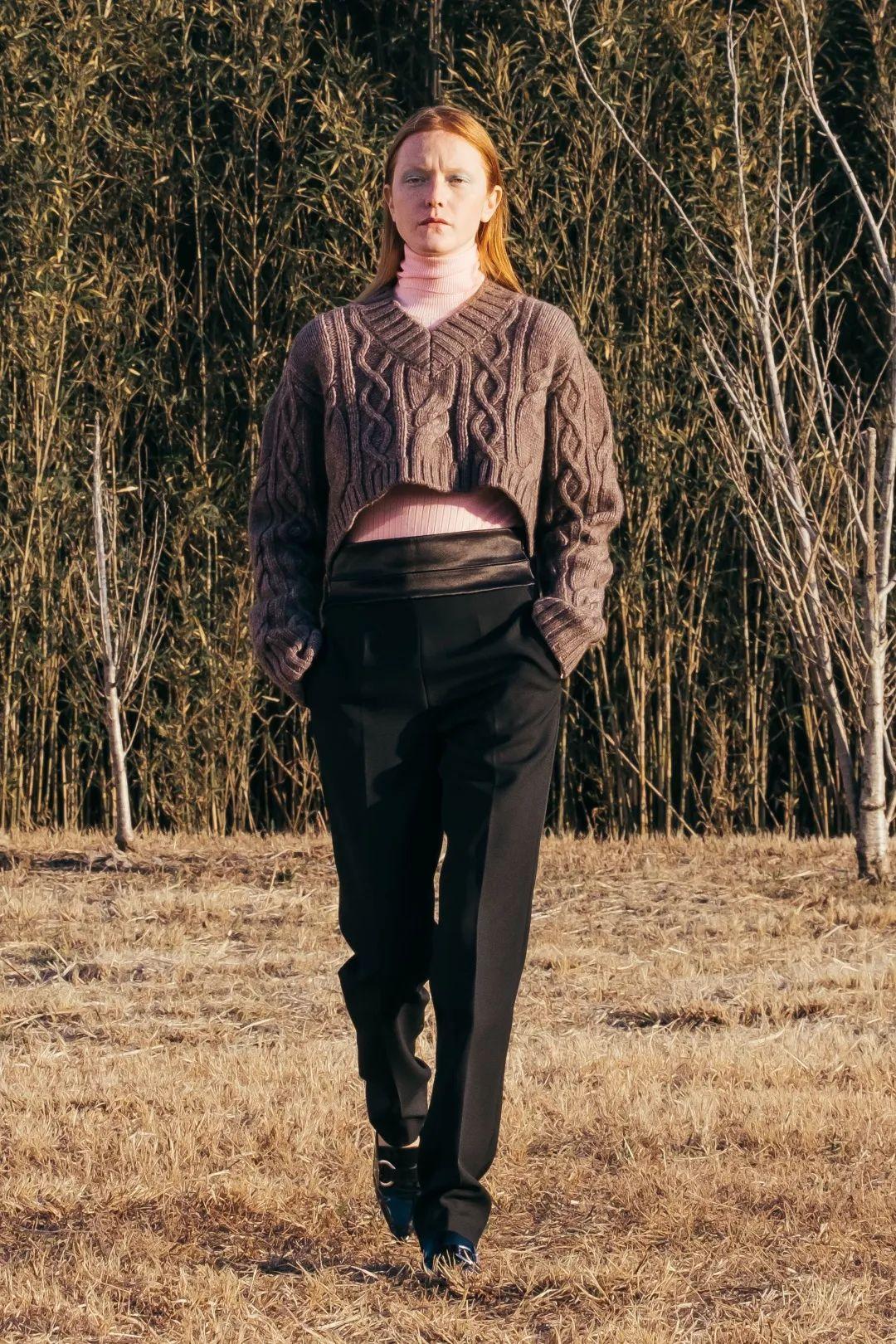 针织常常给人温柔恬静的优雅形象,此次2022秋冬秀场中一些品牌别出心裁的使用粗纱线松散编织工艺呈现镂空细节、超大绞花花型点缀的针织服装,以及规则破坏设计都加大了服装量感,带来了别致的粗旷与不羁气质,少了一分柔美精致,添了几分质朴洒脱。