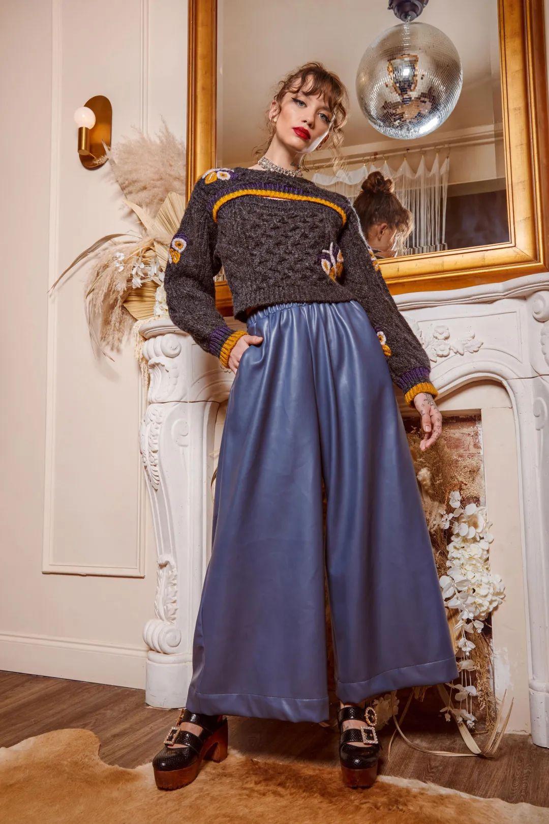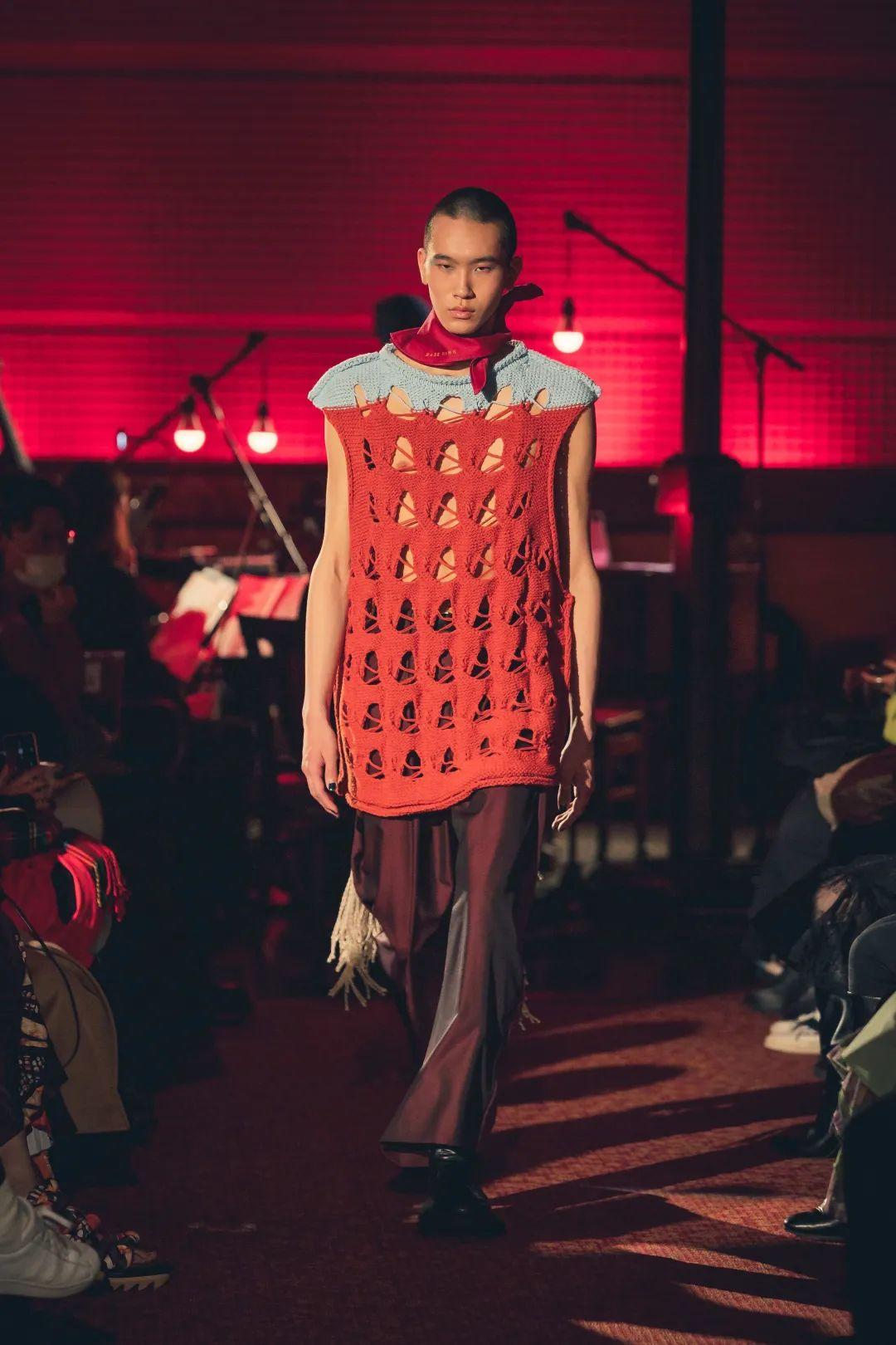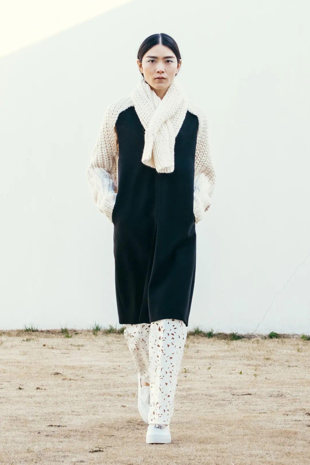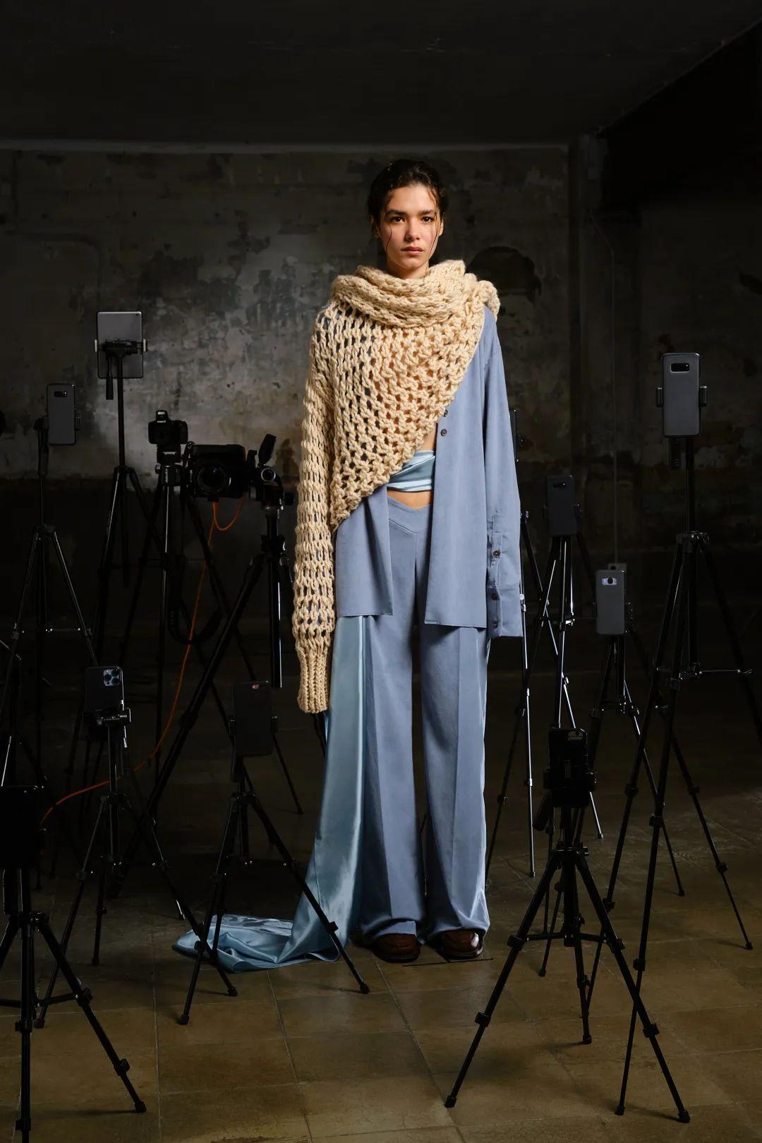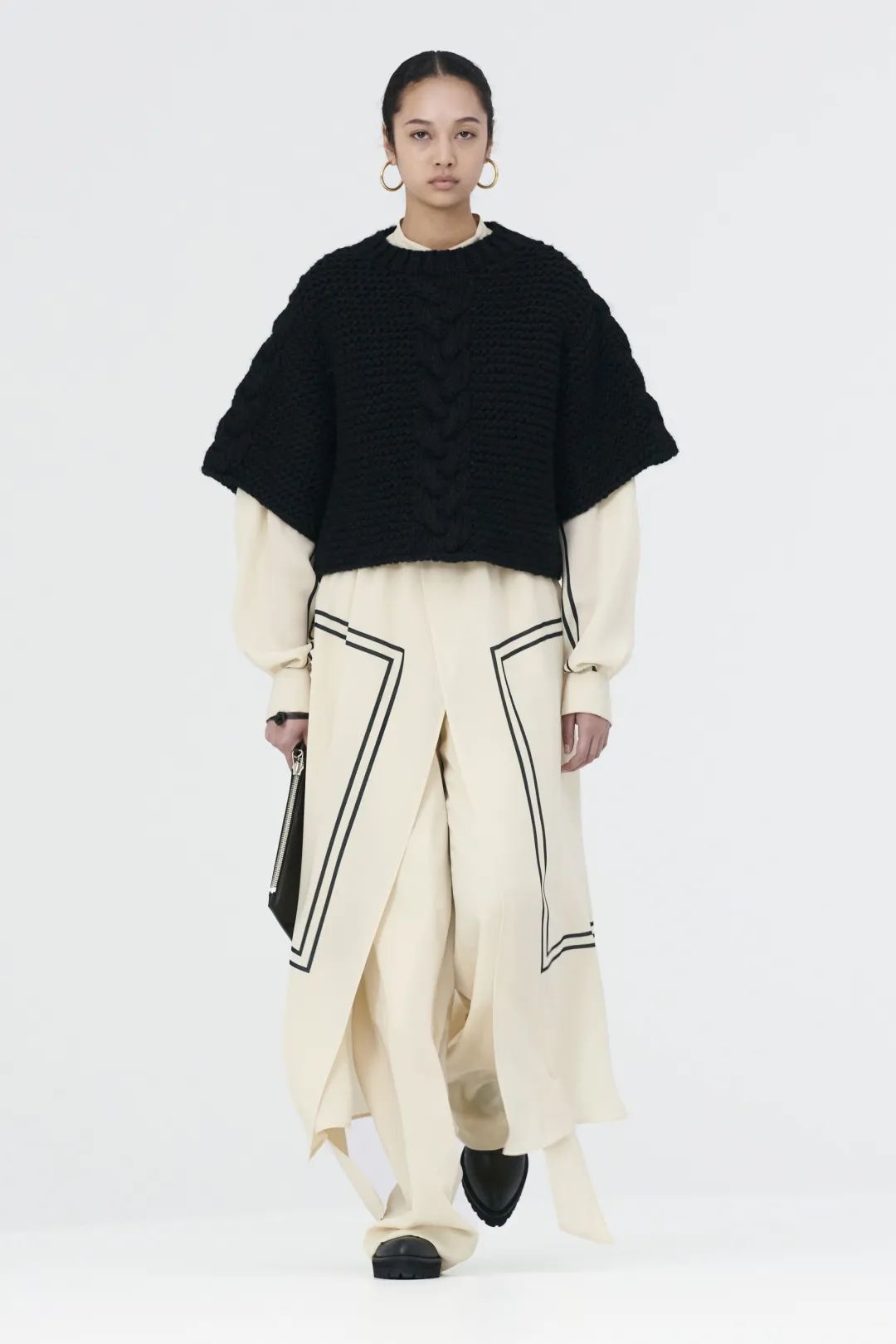 针织常常给人温柔恬静的优雅形象,此次2022秋冬秀场中一些品牌别出心裁的使用粗纱线松散编织工艺呈现镂空细节、超大绞花花型点缀的针织服装,以及规则破坏设计都加大了服装量感,带来了别致的粗旷与不羁气质,少了一分柔美精致,添了几分质朴洒脱。