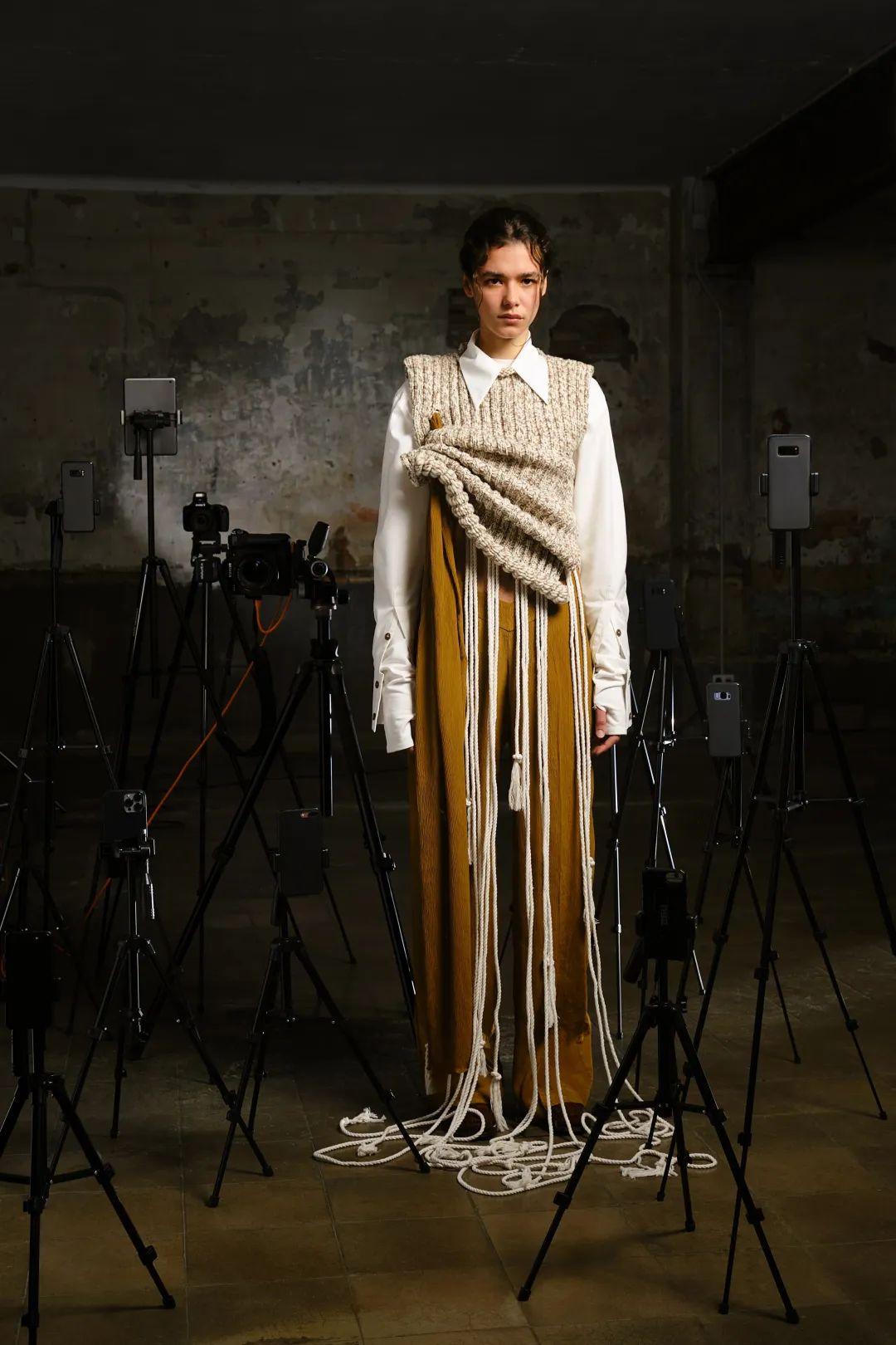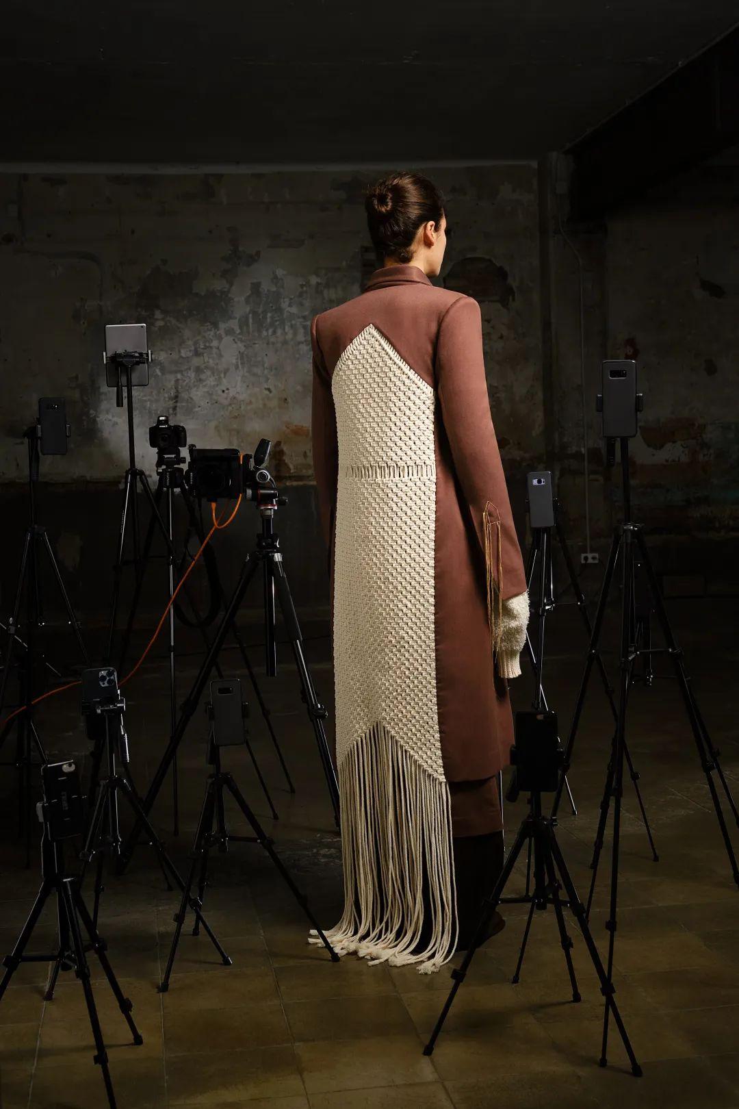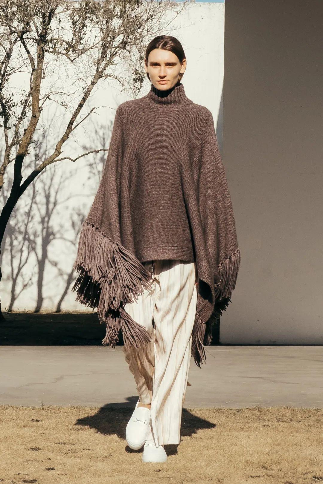 意大利版 vogue 主编 Franca Sozzani 曾如此评价说:“流苏不会消失,它总会回来,不管以何种方式。”在上衣全身、下摆以及裙摆使用纱线进行流苏裁切,为边缘增加了动态感流线;短流苏与缝头外翻,线迹搭缝、做旧感针织结合,根据衣身的肌理走向裁切随身体摆动而摇曳生姿,为简约衣身增加俏皮感,起到很好的点缀作用,彰显女性的柔美力量。