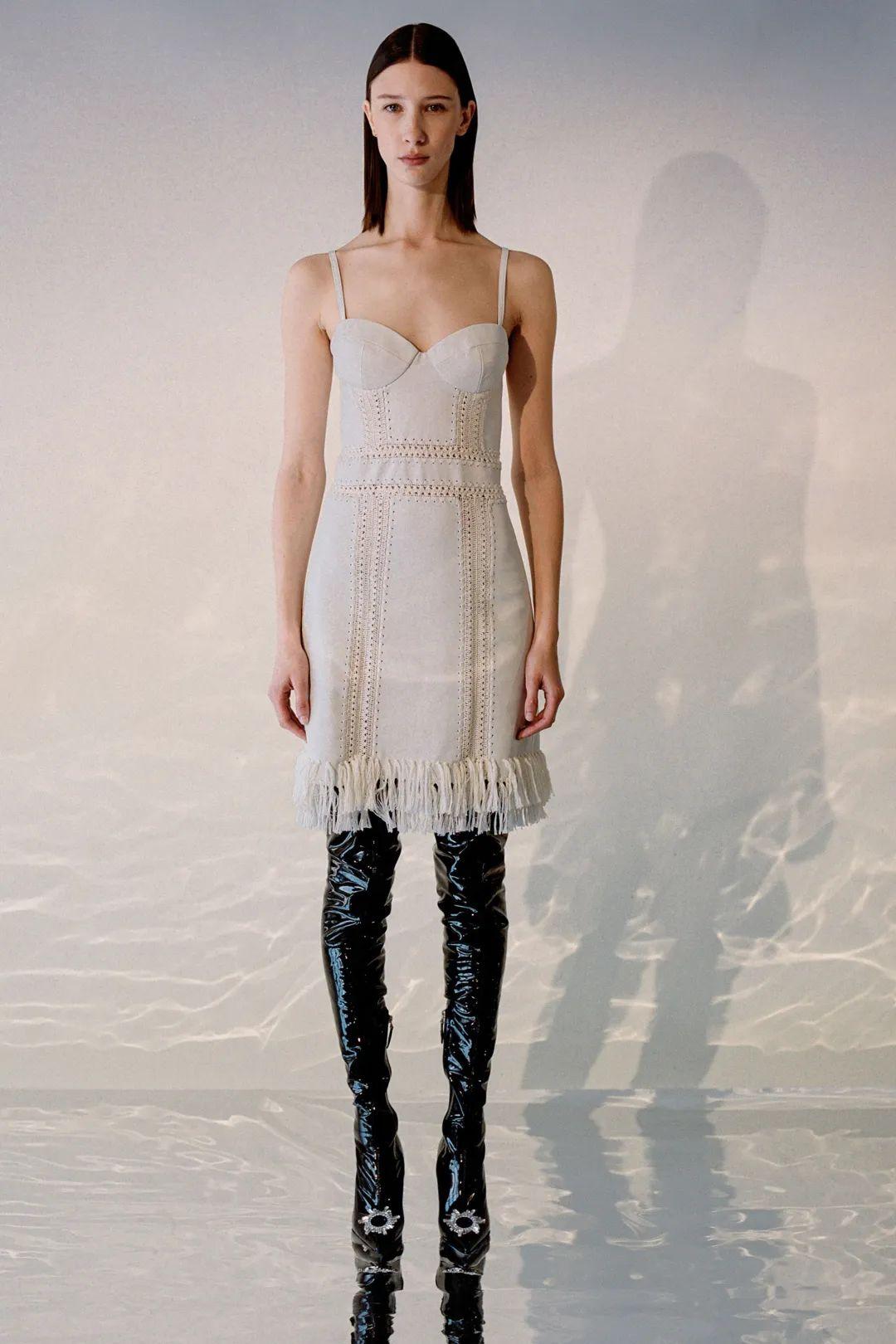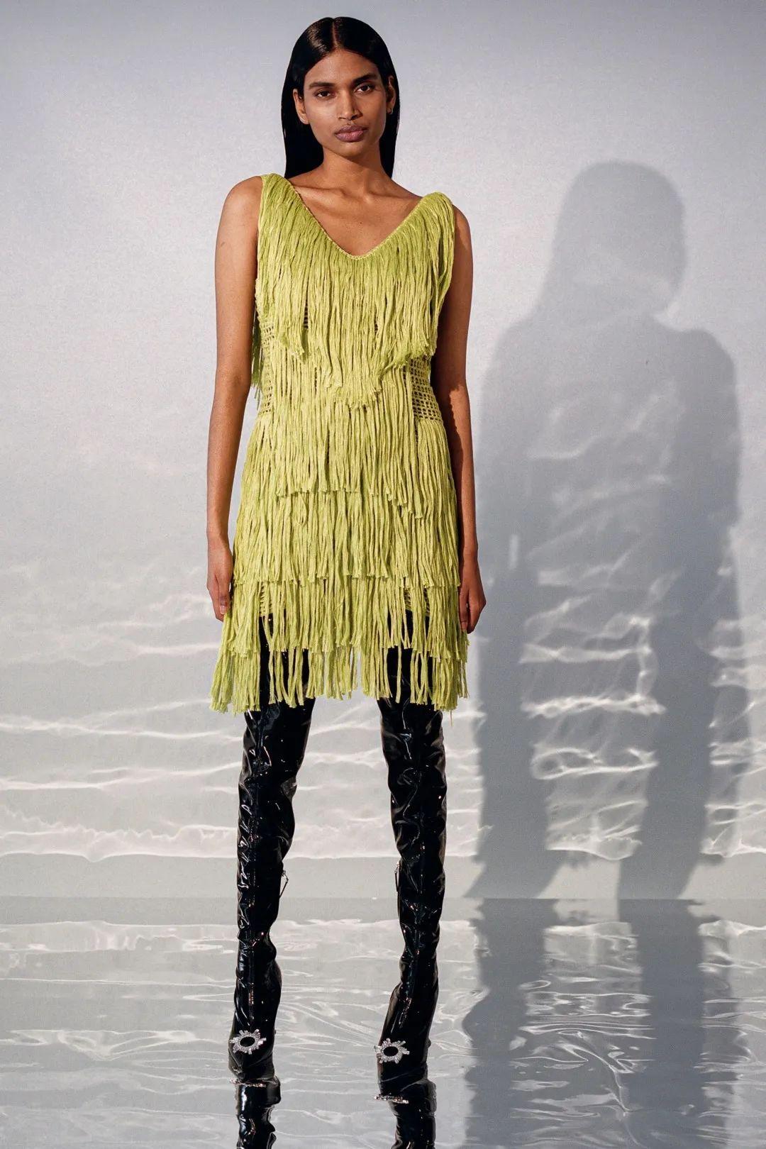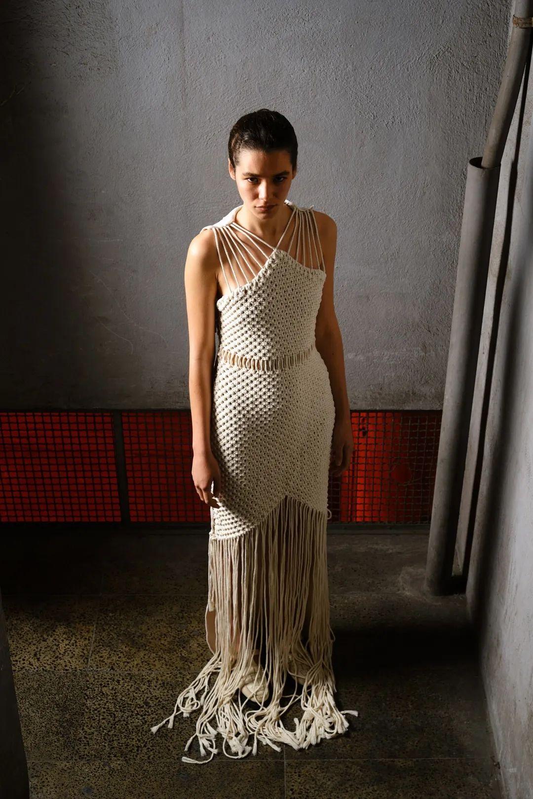 意大利版 vogue 主编 Franca Sozzani 曾如此评价说:“流苏不会消失,它总会回来,不管以何种方式。”在上衣全身、下摆以及裙摆使用纱线进行流苏裁切,为边缘增加了动态感流线;短流苏与缝头外翻,线迹搭缝、做旧感针织结合,根据衣身的肌理走向裁切随身体摆动而摇曳生姿,为简约衣身增加俏皮感,起到很好的点缀作用,彰显女性的柔美力量。