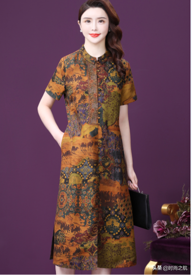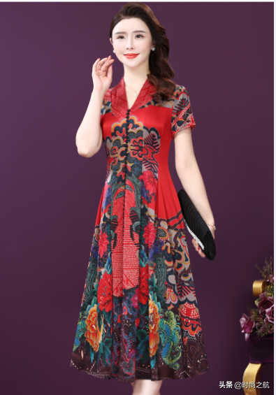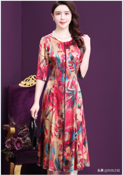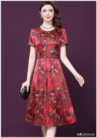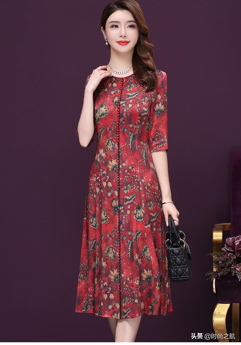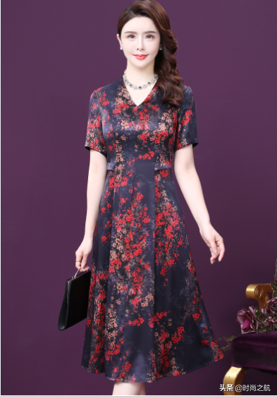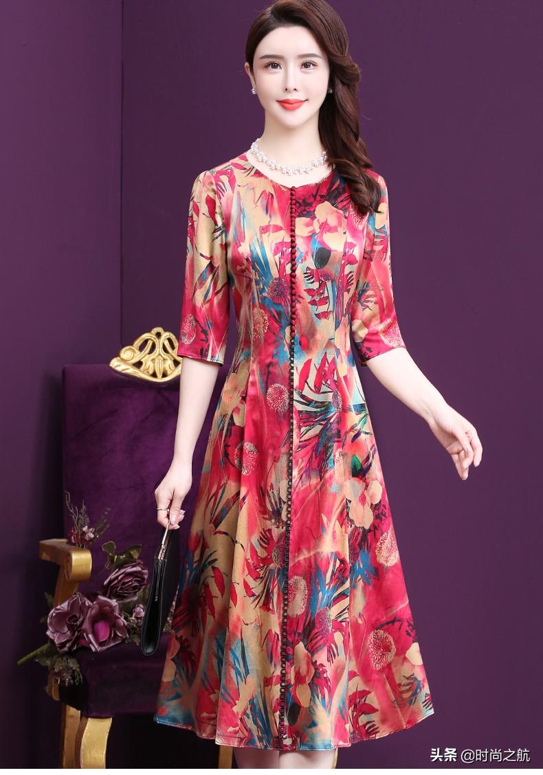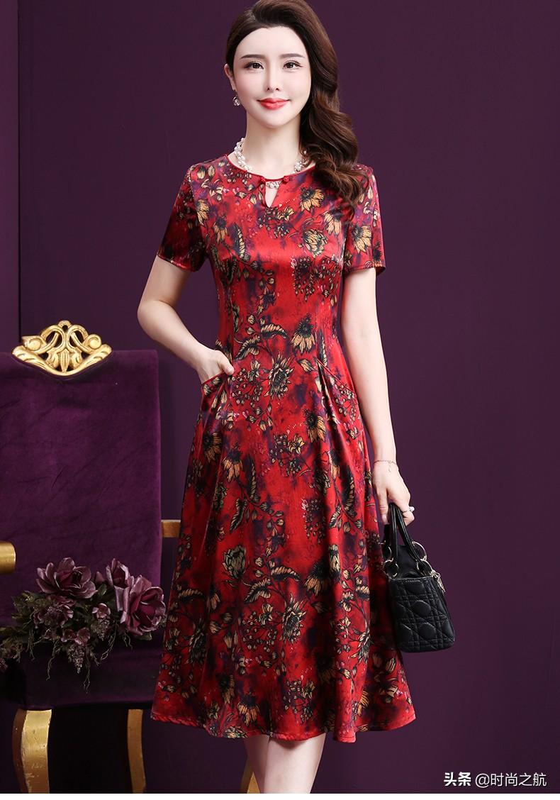 妈妈洋气真丝连衣裙,显年轻印花,显瘦A字裙
