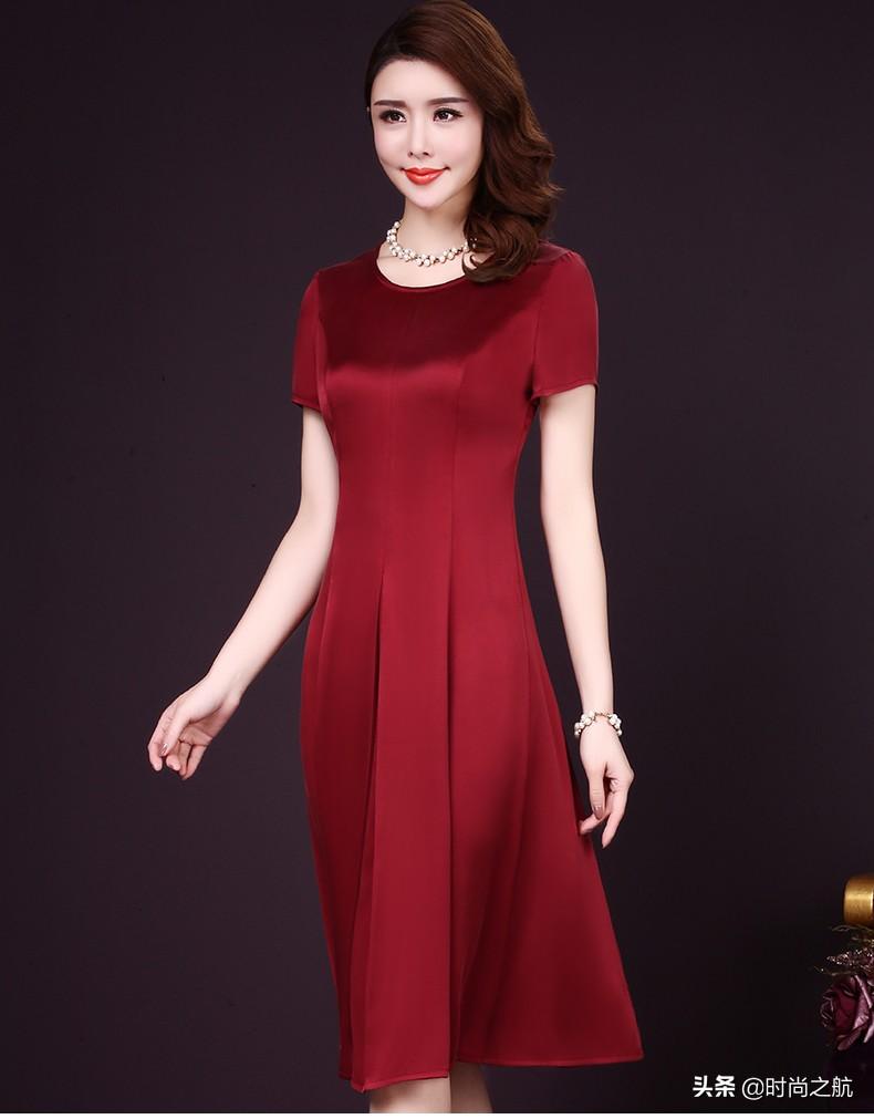 红色喜庆,修身显瘦,时尚A字大摆,短袖真丝连衣裙