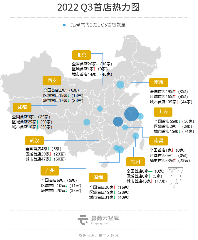 打开三季度944家首店热力图,横向对比2021年同期数据,可看到城市排名进退变化,以及变化背后首店择址的新标准、新方向。