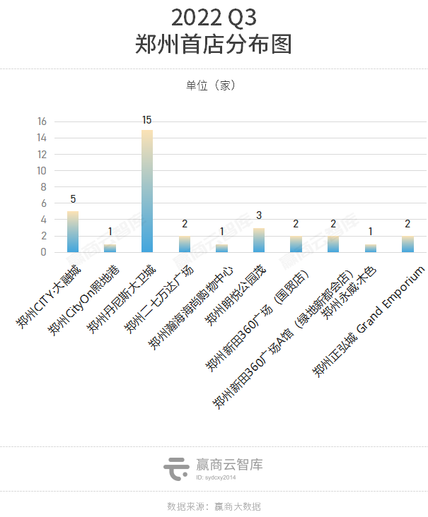 据赢商大数据统计,今年3季度,南昌、郑州引入的首店均为34家,与西安、长沙并列第十。上图中可知,南昌铜锣湾T16、郑州丹尼斯大卫城分别贡献了10家、15家。