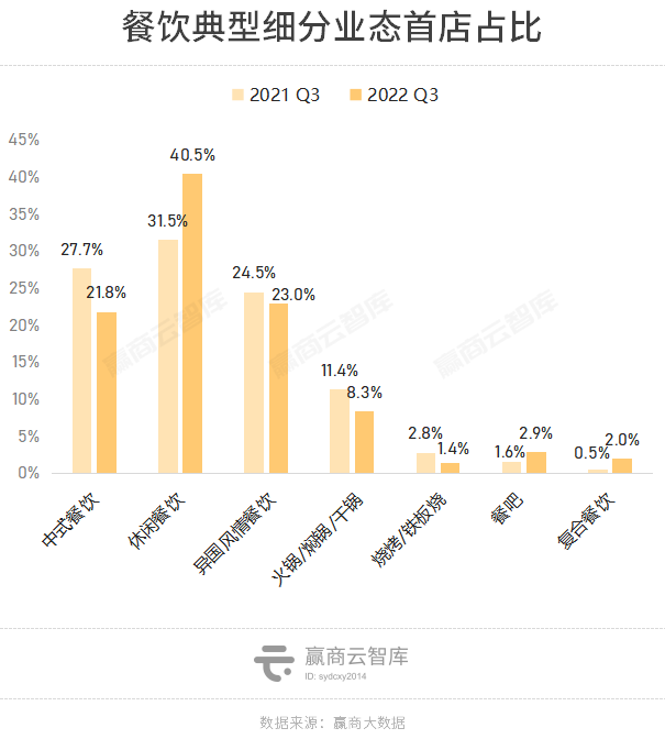 消费频次、客单价下滑,餐饮“刚需化”趋势愈发,餐饮首店拓张变谨慎。据赢商大数据统计,同比2021年,今年3季度,餐饮首店的占比下降,从41.2%跌至36.9%,但涌现了一批赛道新秀。