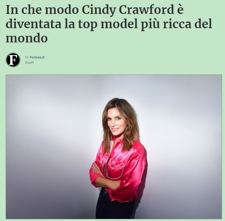 如果你认为,辛迪·克劳馥只是一名曾经火过的模特那就大错特错。今年福布斯全美女富豪排行榜中,辛迪2.25亿身家一举成为世界上富有的超模。