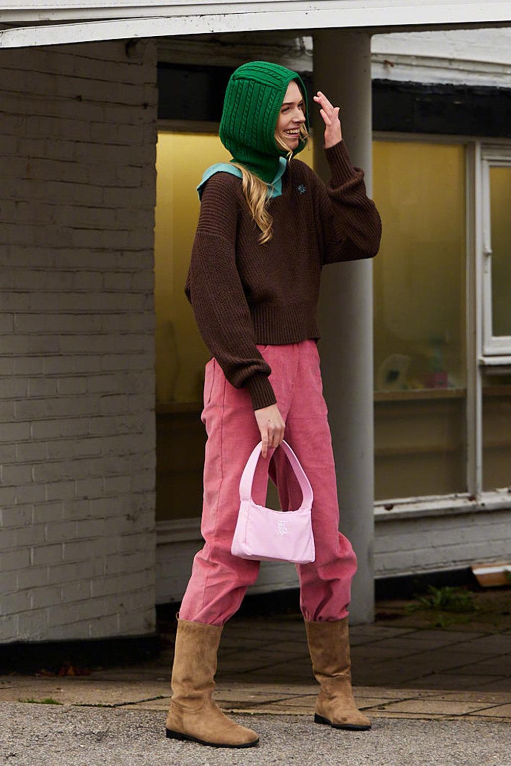 这套搭配讨巧,展示了模特不俗的配色功底。深棕色毛衣搭配粉色长裤,利用下装时髦法将层次对比做到。