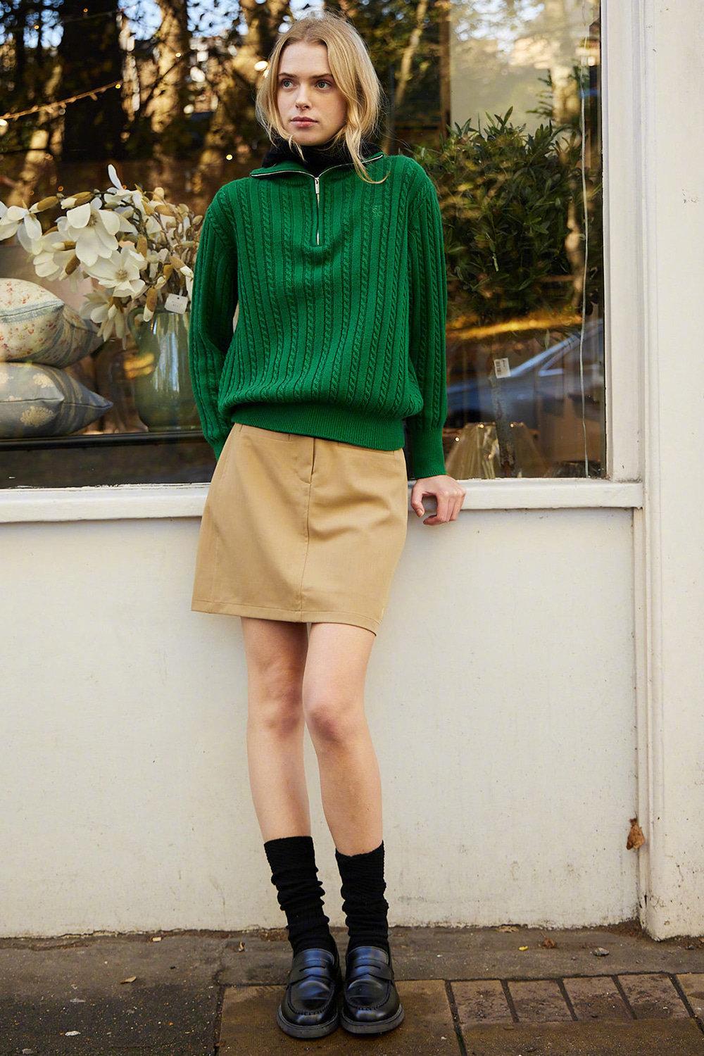 灵动活泼的青春美少女,喜欢为脚下预留时尚空间。绿毛衣搭黑色短裙,配一双棕色长靴,故意用白袜子装点细节,呼应着脖间留白。