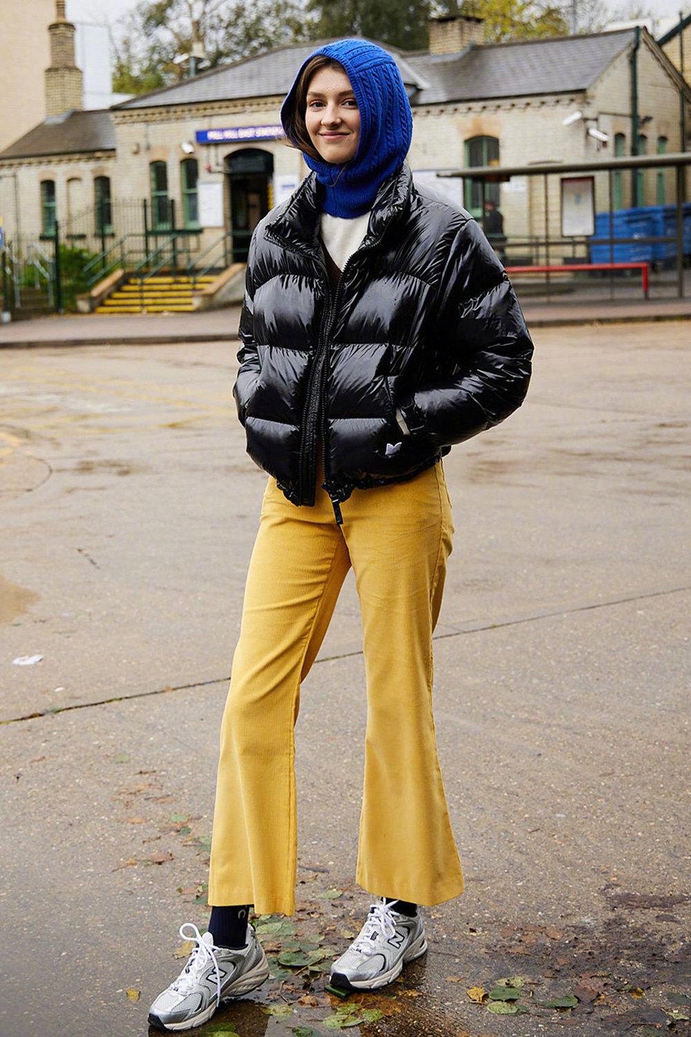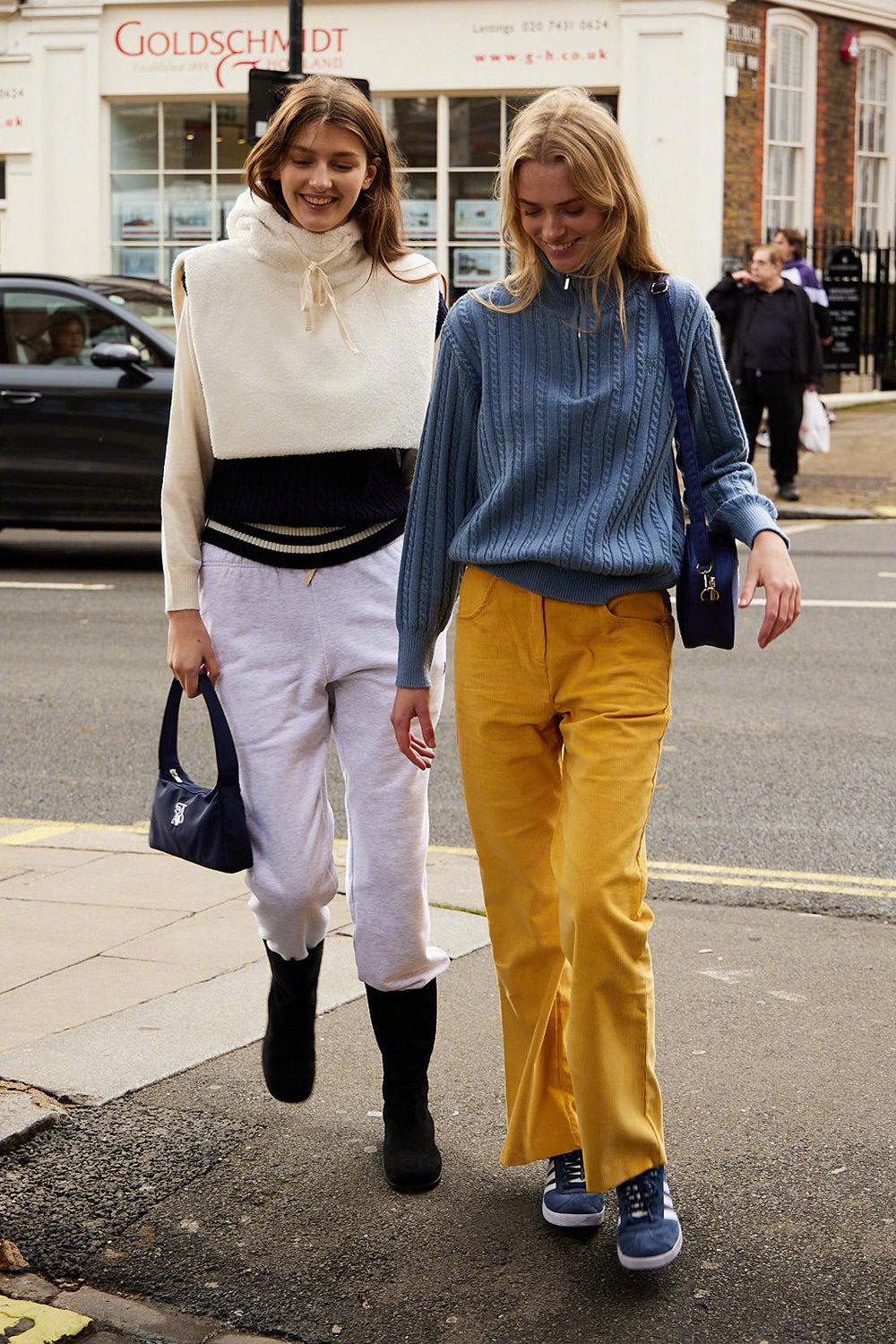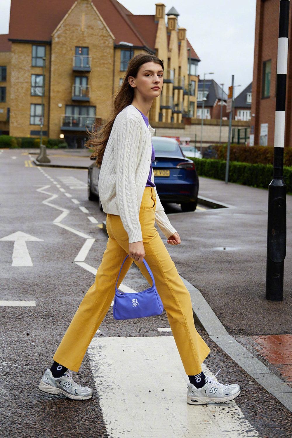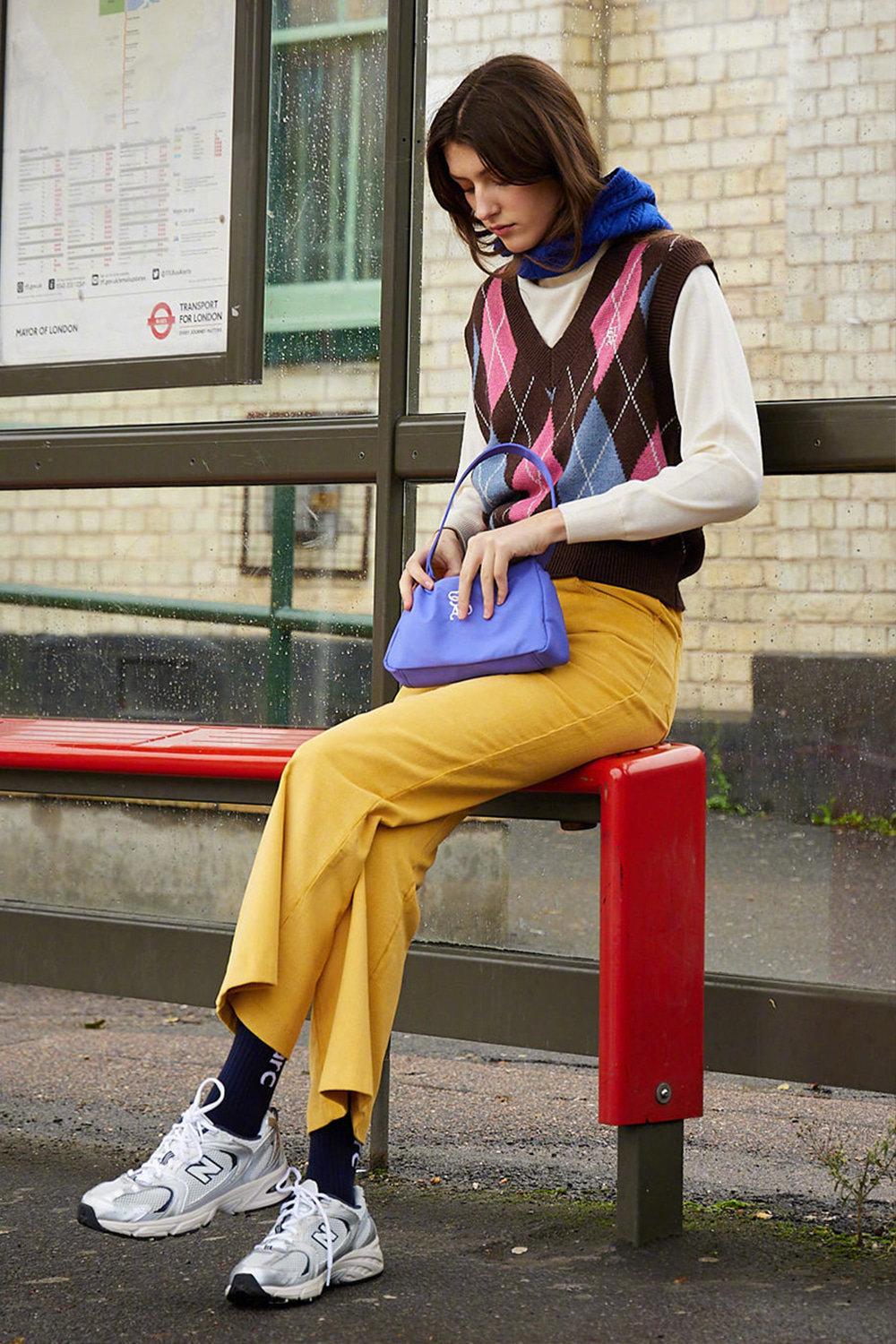 大面积的黄色裤子是主角,搭配一件粉棕拼色针织马甲,蓝色围巾点缀,紫色包包呼应,颜色丰富却不凌乱。