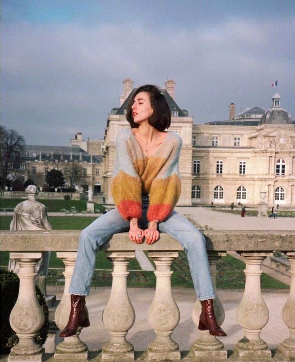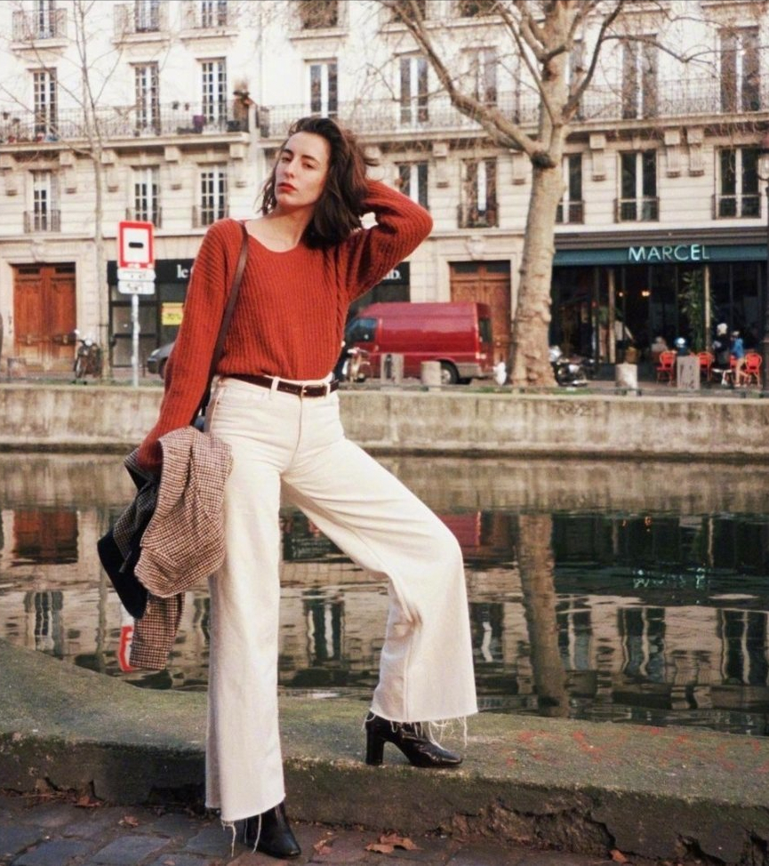 一件复古红毛衣,搭配白色裤子,书写着法式风的浪漫经典。