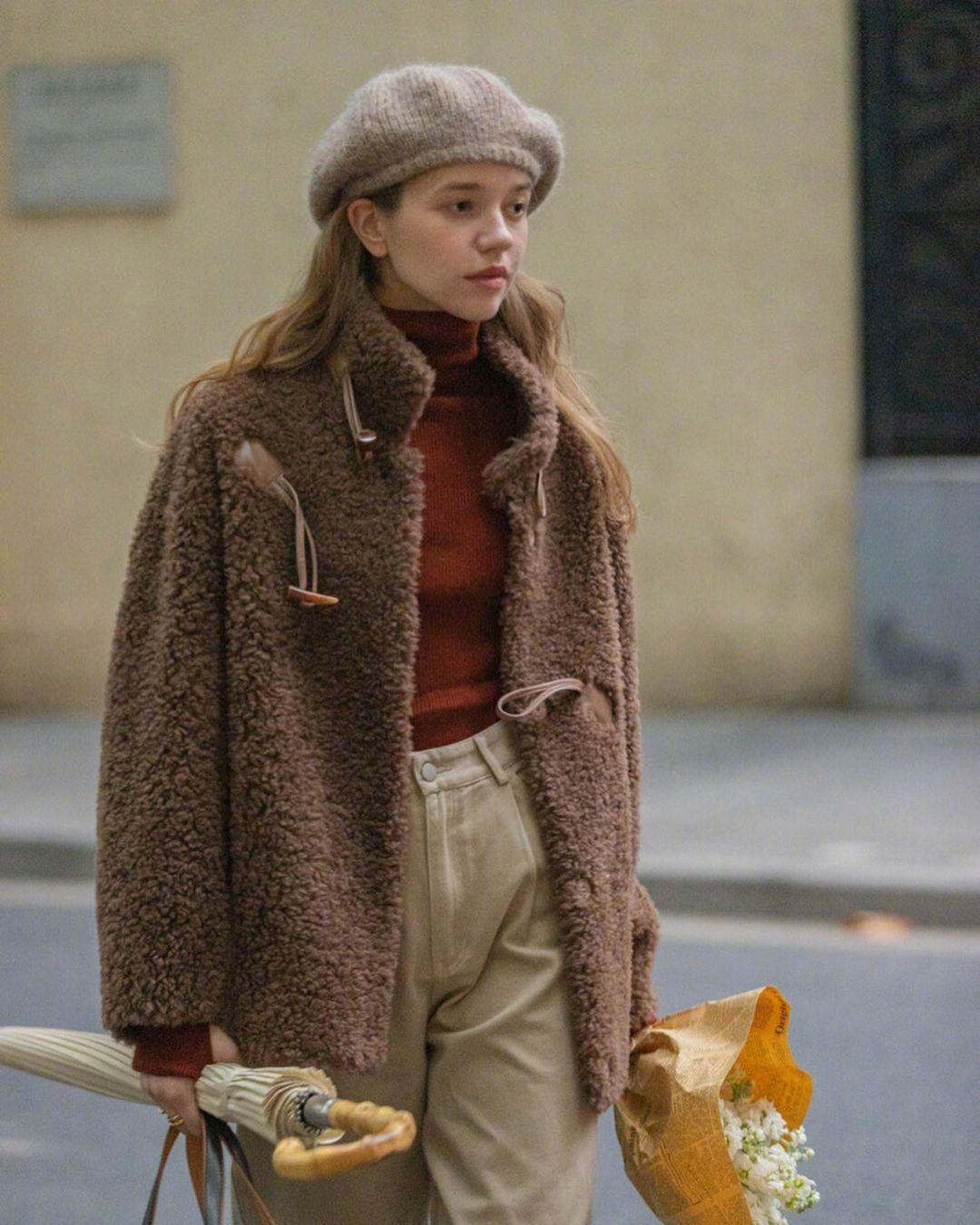 棕色毛毛外套,内搭复古红色针织衫,再配一条米色裤子,顺势而为的配色腔调,满是大气与经典。沿袭复古风范,又有着当下流行的新风雅趣。