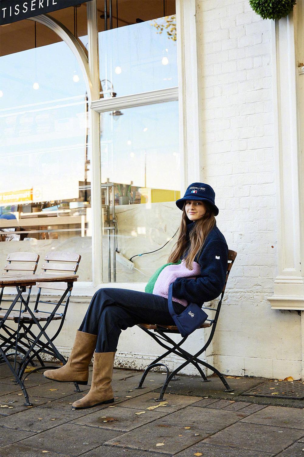 搭配白毛衣、黑裤子,脚踩棕色长靴,低调的时髦呼之欲出。