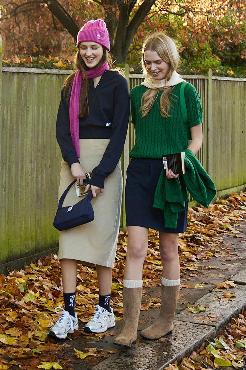 比如,灰色毛衣+棕色半裙,故意用蓝色帽子和围巾点缀,就是复古撞色的意外之喜。蓝白休闲鞋、包包呼应,整体搭配无懈可击。