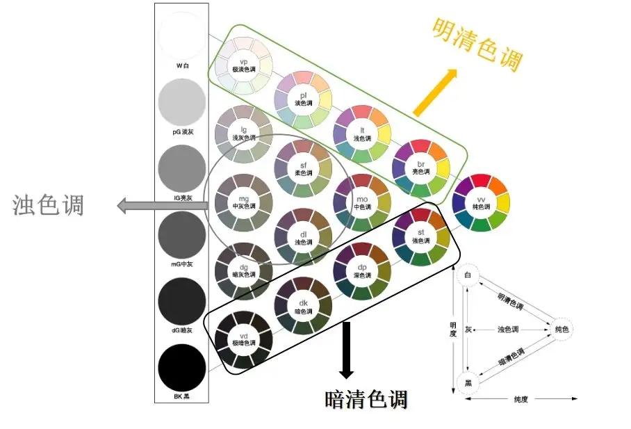 明度从低到高为纵向标、纯度从暗到正为横向标,将所有色彩划分为亮色调、中间色、暗色调所组成的N个色调。