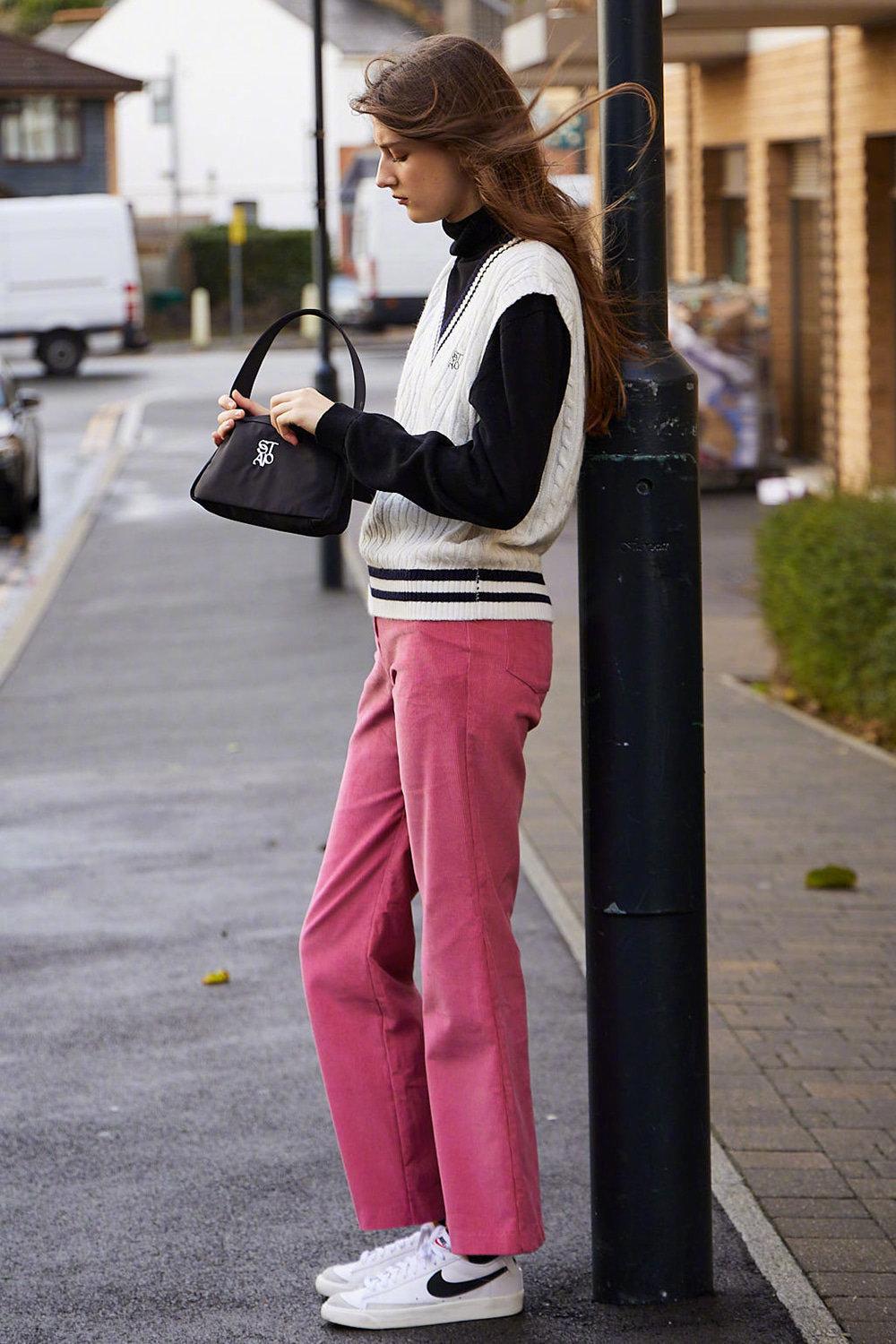 复古粉色长裤,很容易在人群中脱颖而出。秋冬的款式,好选择直筒裤型,面料以灯芯绒、丝绒为佳。有了它,时髦就跑不了。