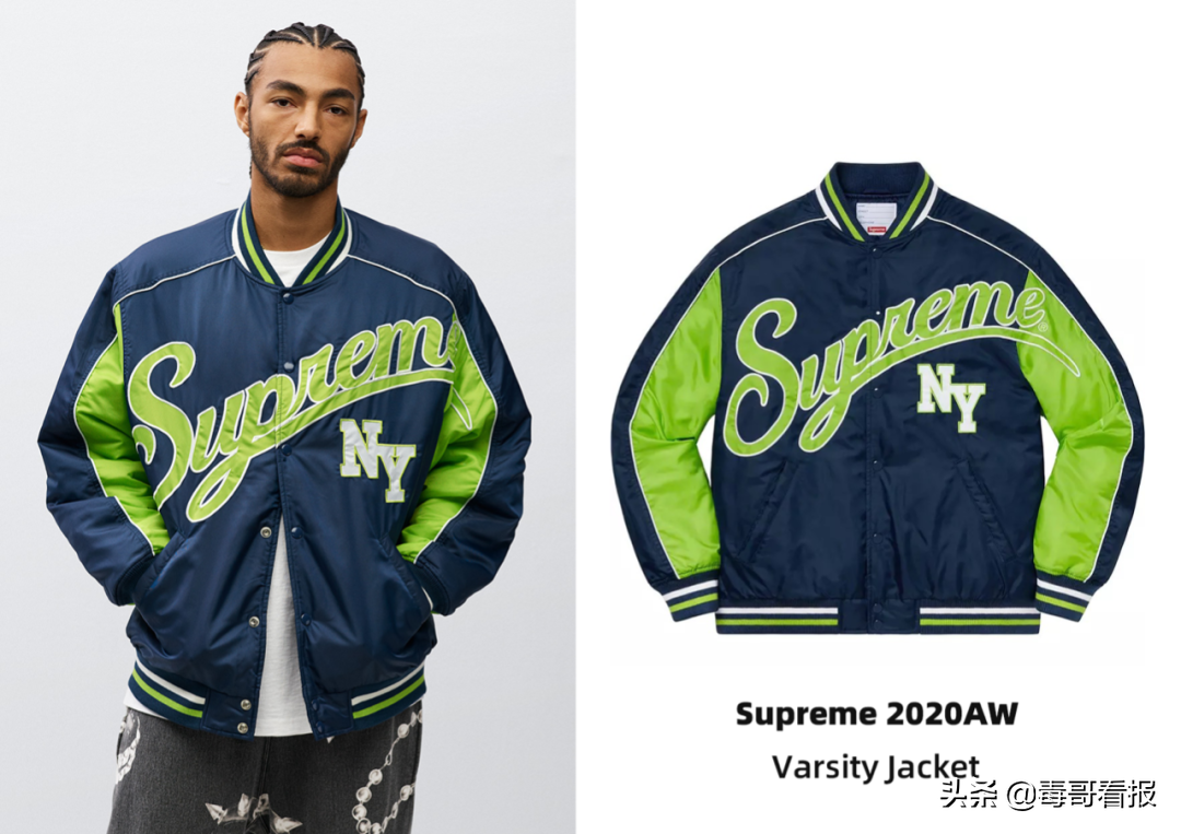 Supreme 2020秋冬单品中,这件蓝绿棒球夹克十分惹眼,尼龙内夹棉的设计,帅气之余保暖果也不错。