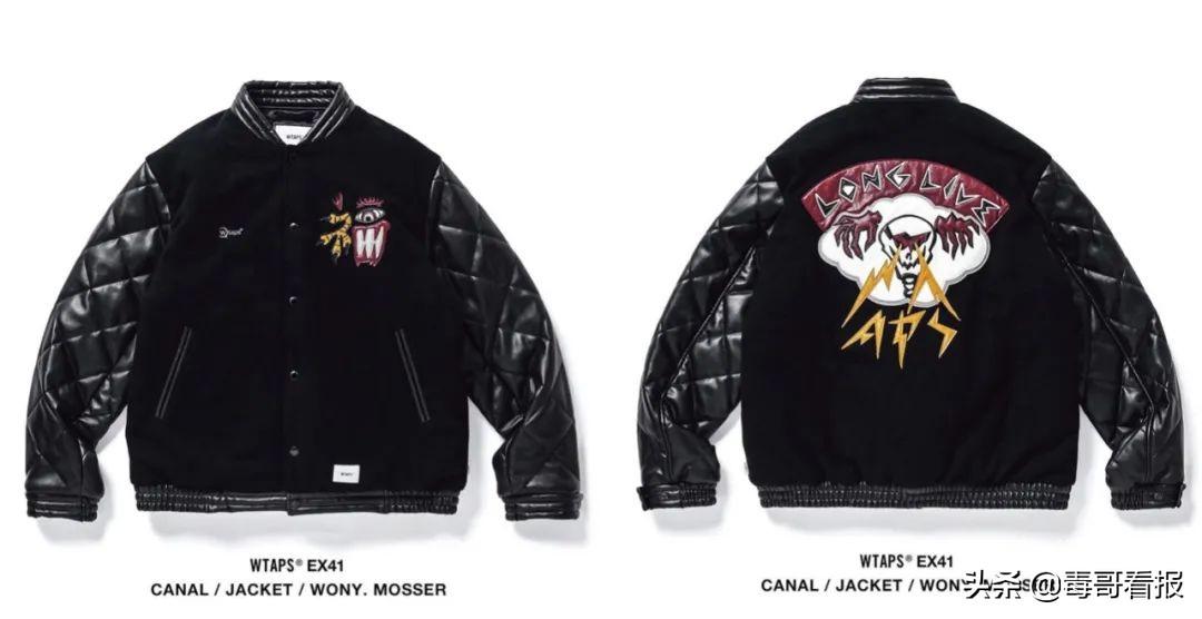 这件 Wtaps 秋冬新品,采用羊毛和合成皮革拼接,胸部有汉字「福」和品牌徽标刺绣,后侧有贴花的骷髅图案,两袖菱形图案处理,整体细节十足。