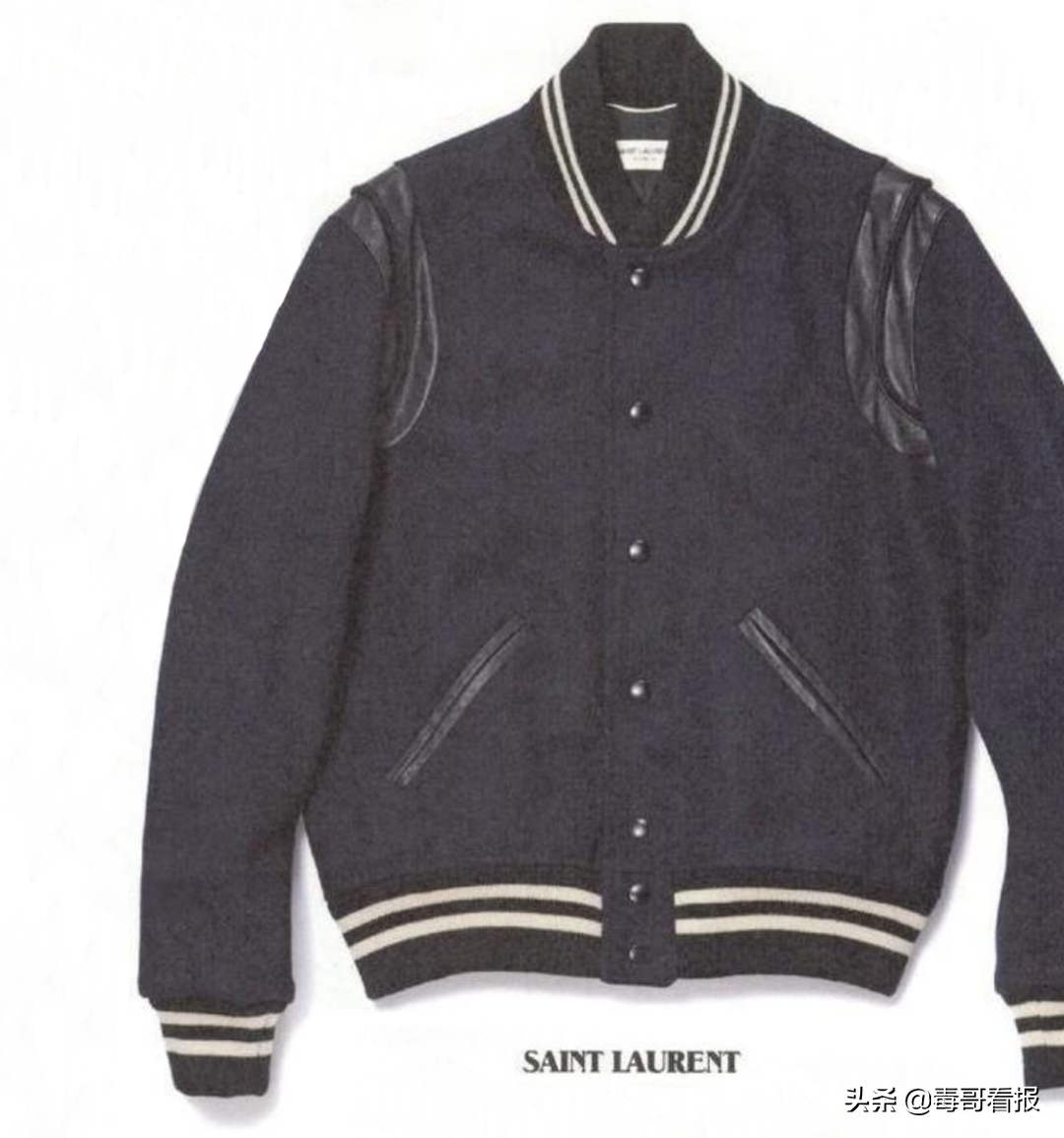 经典棒球夹克有4个特征:1)领口、袖口、底摆罗纹采用条纹;2)用按扣做连接件;3)衣身毛呢材质,两袖为皮革;4)具有特殊含义的字母补丁贴。
