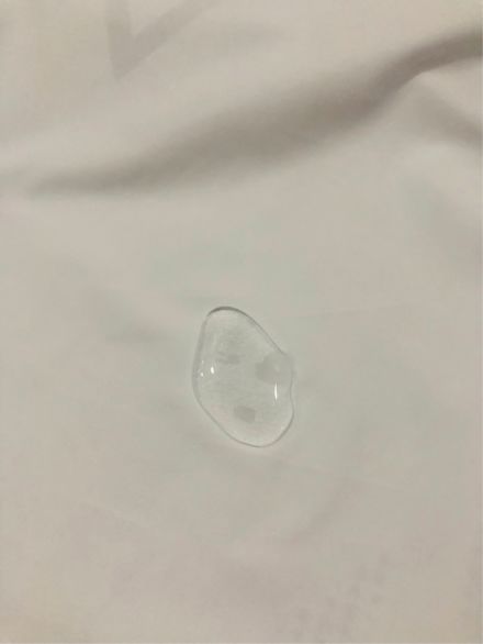 要测试其防水性,自然是做泼水试验了。先是往衣服上泼一小杯水(约5毫升),水滴如油般在衣服滑过,完全不渗入衣服内;再把衣服平躺慢慢倒水,目测5秒以内仍能保持水滴形状,此试验足以说明这件速干衣的防水性是较强的(Nike那件是迅速渗入,不防水)。