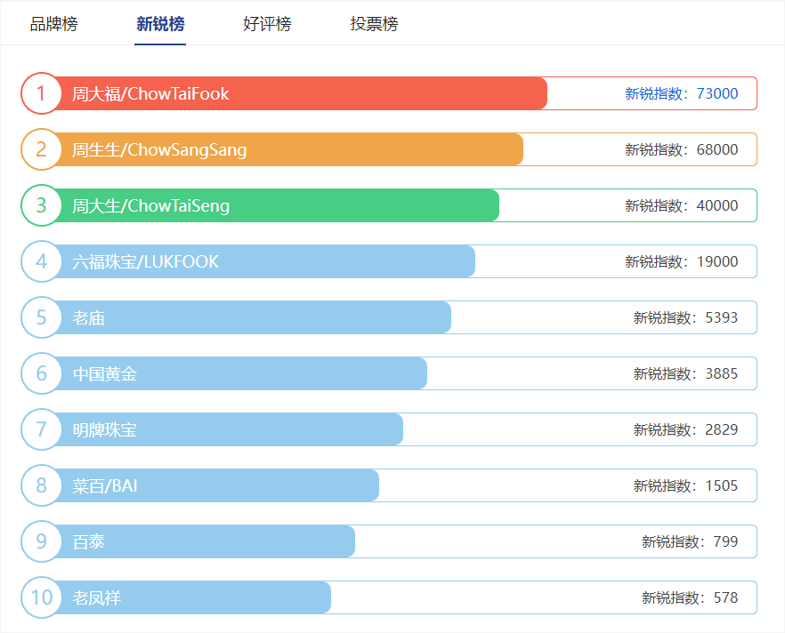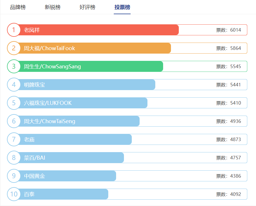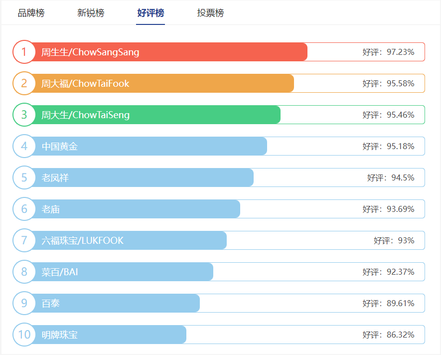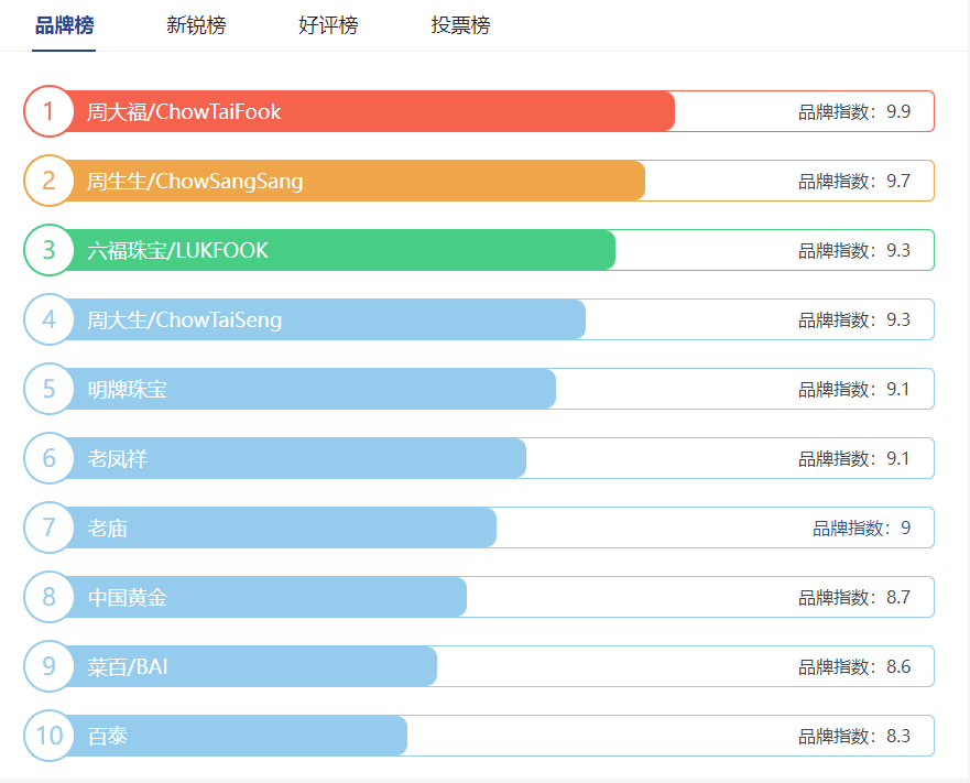 根据品牌评价以及销量评选出了2022年首饰十大品牌排行榜,前十名分别是周大福/ChowTaiFook、周生生/ChowSangSang、六福珠宝/LUKFOOK、周大生/ChowTaiSeng、明牌珠宝、老凤祥、老庙、中国黄金、菜百/BAI、百泰 。如果您正在查找首饰什么牌子好?那么本次十大品牌榜单可供您作为选购参考,