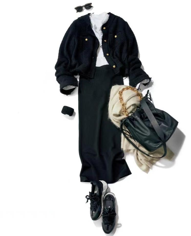 下摆渐宽,修饰身材也是。各类腿部的疑难杂症一 一被弱化消解,小A半裙功不可没。这套搭配,黑色皮衣与高级灰色半裙,一潮酷一高级,配合默契。