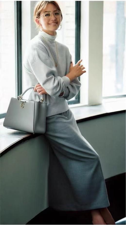 一点红,也是启动女人味的密钥。与红唇上下呼应,这款红色包包的介入,才是白毛衣与黑裤子富有曲线氛围的关键啊。