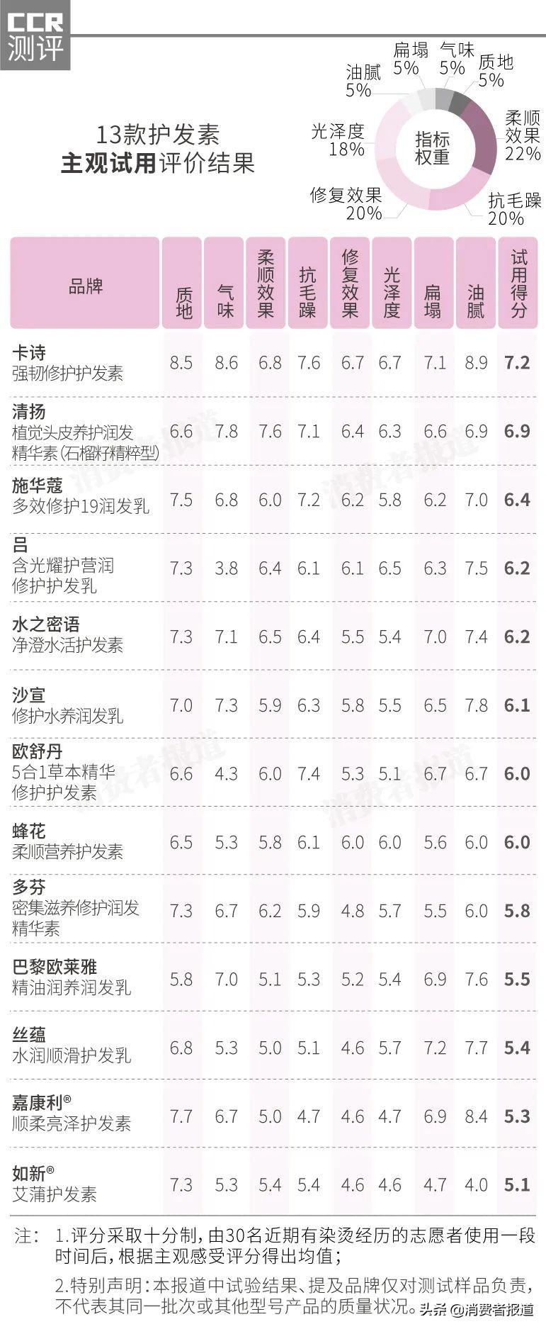 综合质地、气味、柔顺、修复、抗毛躁、光泽度、扁塌、油腻8个方面,此次13款护发素的试用评价结果中,卡诗表现亮眼,收获了许多为志愿者的“好评”,对得起它300多块大洋一小支的高价,而如新、嘉康利、丝蕴等三款护发素相对较逊,排名垫底。