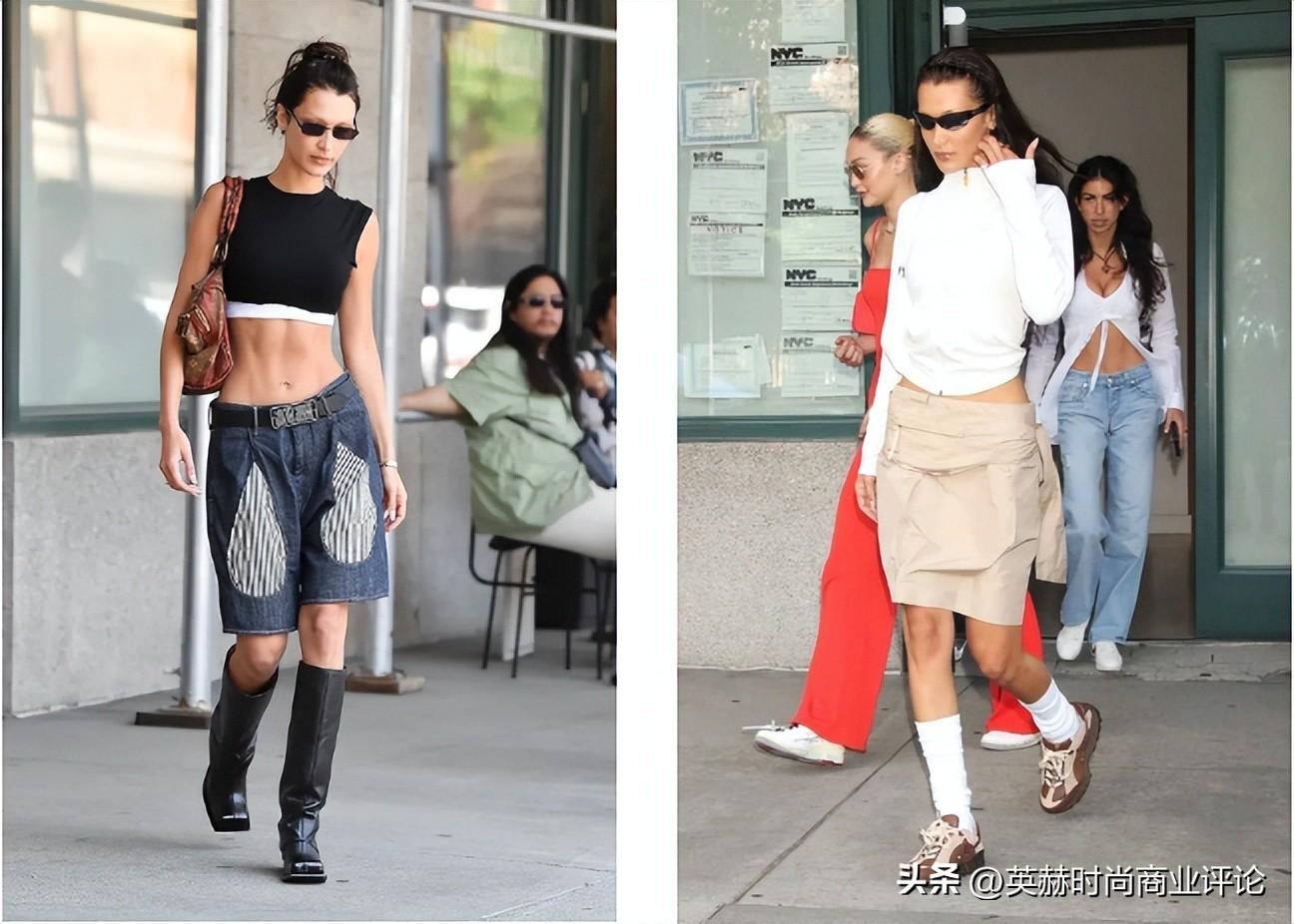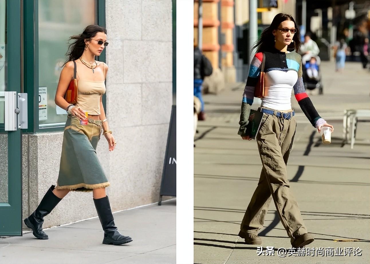 不仅如此,Bella Hadid在平时的穿搭街拍中也开创了自己独特的「Bella风」着装方式,既融合了当下的Y2K风潮,又有复古混搭的Vintage风格。这些「贝式穿搭」不仅推动了风格趋势,也反映出Bella作为超模、时尚Icon所代表的、正在更新的时尚品味。