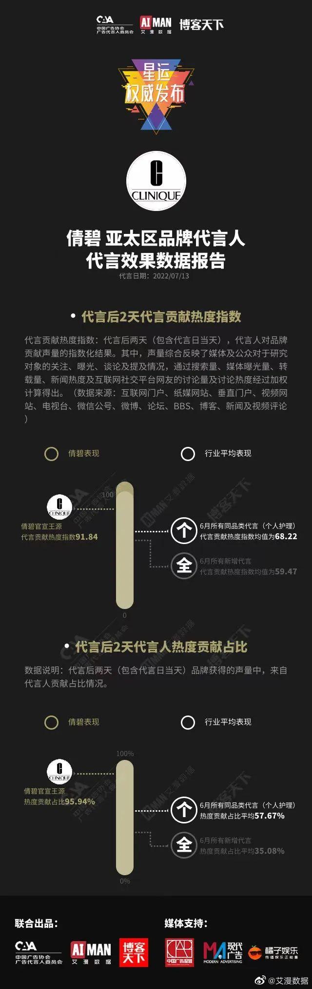 除了凝脂点漆之外,王源的商业价值也一直是品牌方考量的因素之一,而王源的商业价值也早在德亚代言时就已尽数凸显,而此次和倩碧的合作也可谓是强强联合,根据数据显示7月13日倩碧官宣王源为亚太地区品牌代言人后两天代言热度贡献指数就达91.84%,超过六月同类代言平均水平68.22%,以及6月所有新增代言的平均水平59.47%,同时品牌在官宣后所获得的声量有95.94%也都来自于王源。