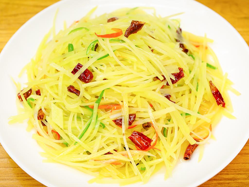 酸辣土豆丝1.土豆去皮切成土豆丝,切好以后直接用水泡上;调碗料加盐、味精、白醋拌匀备用。