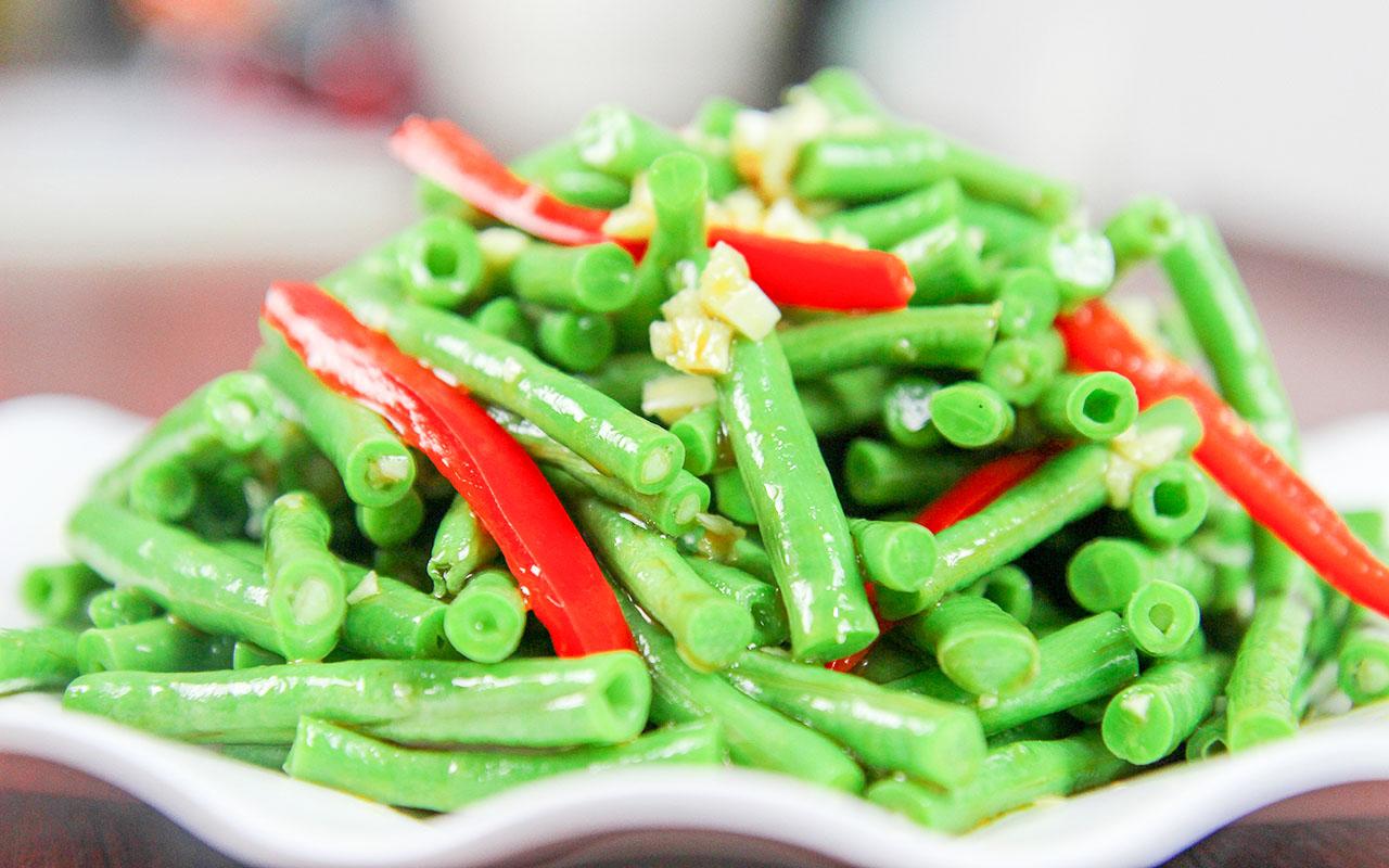 凉拌豆角1.豆角切成2厘米左右的段;红辣椒一片去籽后切成宽条;大蒜5粒切成碎沫。