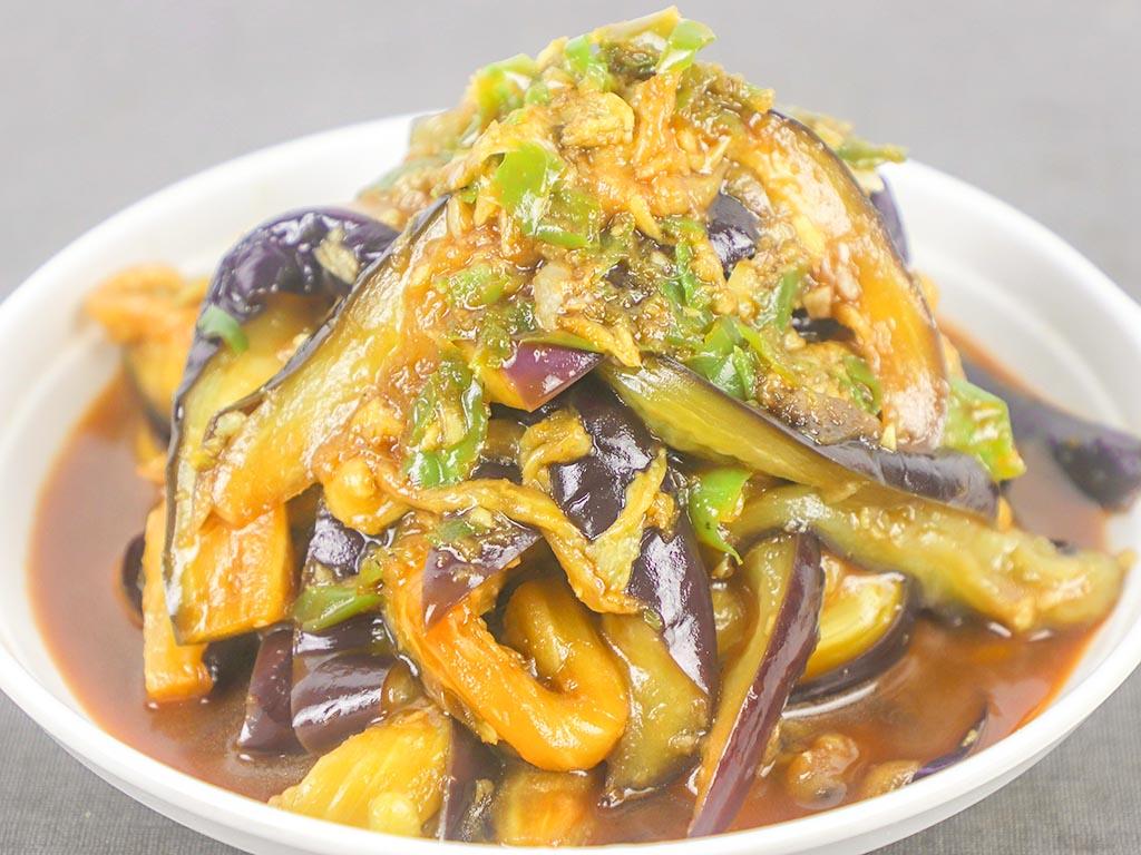 4.锅中烧水,放上篦子,水烧开以后把茄子放入锅中,开中火蒸5分钟,把茄子取出放在笊篱中,挤压出茄子中的水分,然后把茄子放入盆中,倒入调好的酱汁颠盆拌匀后即可装盘。